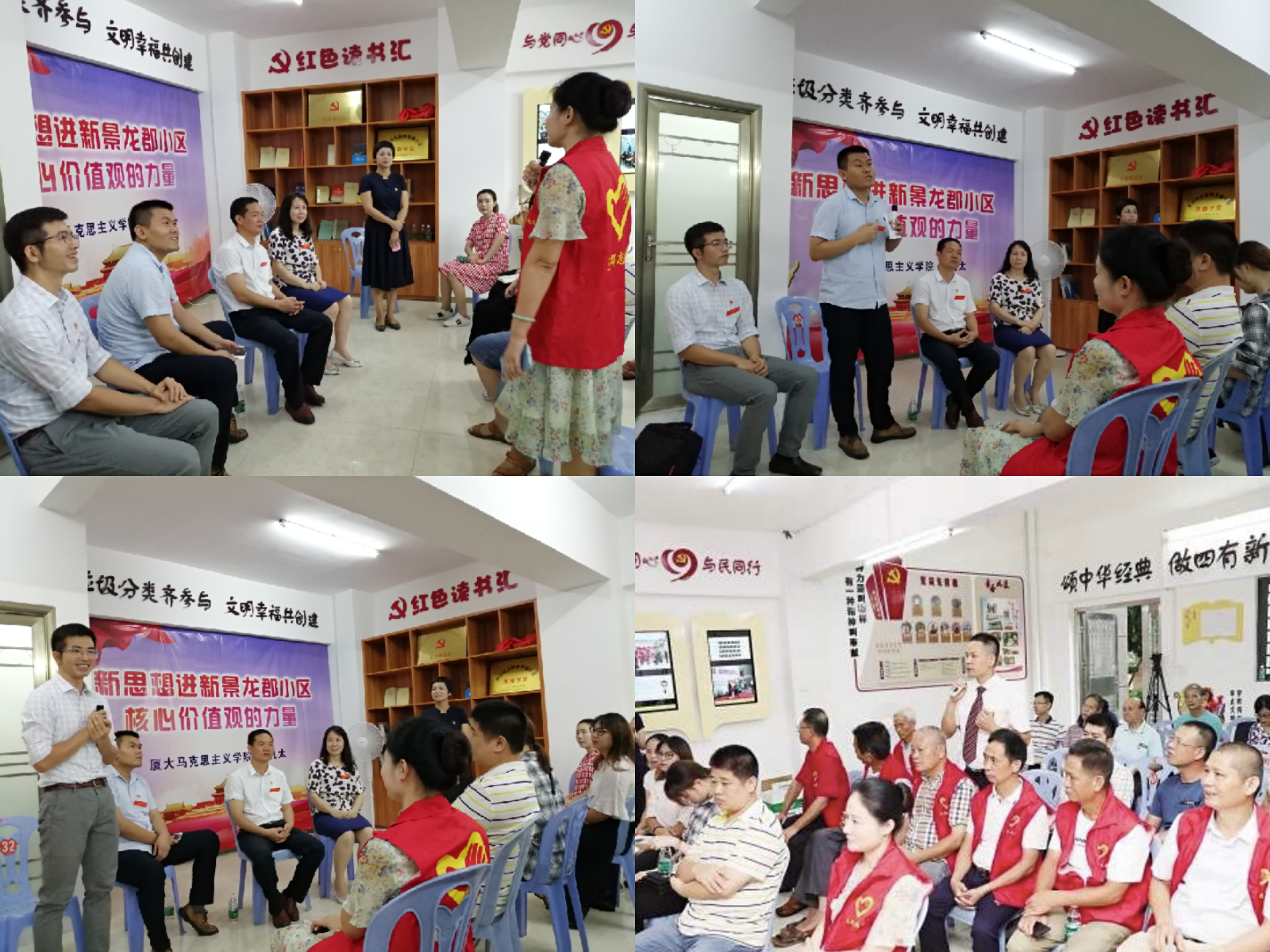 为深入推进习近平新时代中国特色社会主义思想“飞入寻常百姓家”,7月19日下午,马克思主义学院党委书记侯利标,马克思主义中国化教工党支部书记、福建省社科研究基地中国特色社会主义研究中心首席专家冯霞教授一行前往湖里区禾山社区新景龙郡小区开展“新思想进小区”宣讲活动启动仪式暨首场理论宣讲活动,赢得了当地广大干部群众的纷纷点赞。中共厦门市湖里区委宣传部常务副部长周福民到场指导。马克思主义学院马克思主义中国化教工党支部、博士研究生党支部的党员代表参加此次活动。