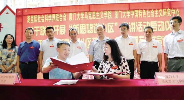 学院党委书记侯利标表示,校地联手开展“新思想进小区”理论宣讲活动,让理论宣讲不再高冷,而是更接地气,既有高度又有温度,这也是我们理论工作者的初心和使命。学院将以马克思主义中国化教工支部党员为主,吸收博士研究生支部力量,充分发挥专业优势,坚持将理论宣传与支部建设、服务社会有机结合起来,做到“教”“学”相长、以“理”服人、相互促进。冯霞教授介绍,此次与湖里区社会科学界联合会联合举办的“新思想进小区”系列活动得到了各方重视。从今年4月开始,双方就反复进行沟通,商定活动实施方案。按照双方合作协议,“新思想进小区”宣讲活动将覆盖到湖里区的所有街道,每个街道选取1-2个小区,探索出一套用新思想帮助小区居民解决思想困惑与现实问题的新模式。