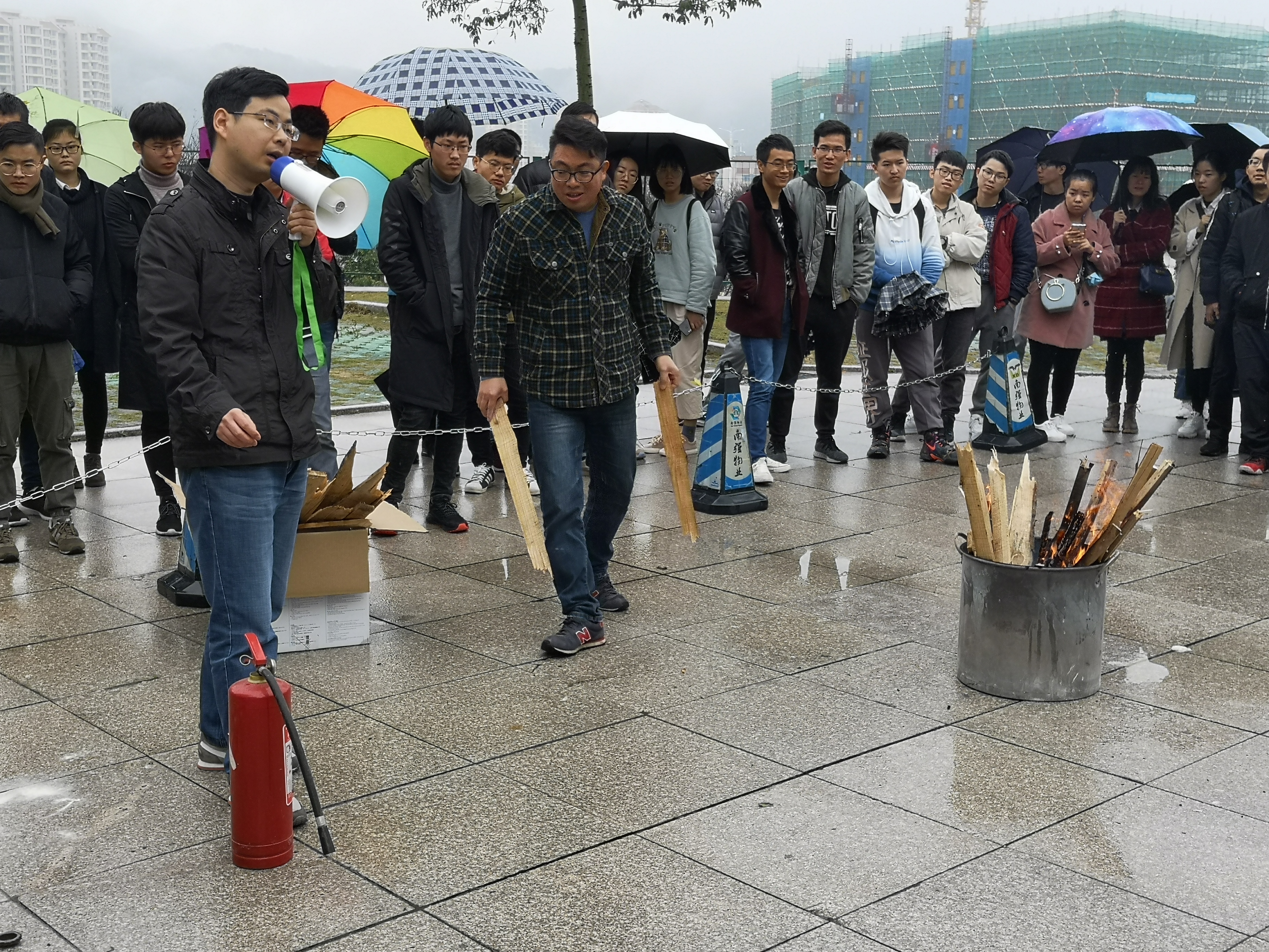 在消防演练环节,孙俊逸介绍了消防基本知识,详细讲解了灭火器的分类及具体使用操作,并组织现场师生逐一进行实际操作演练。