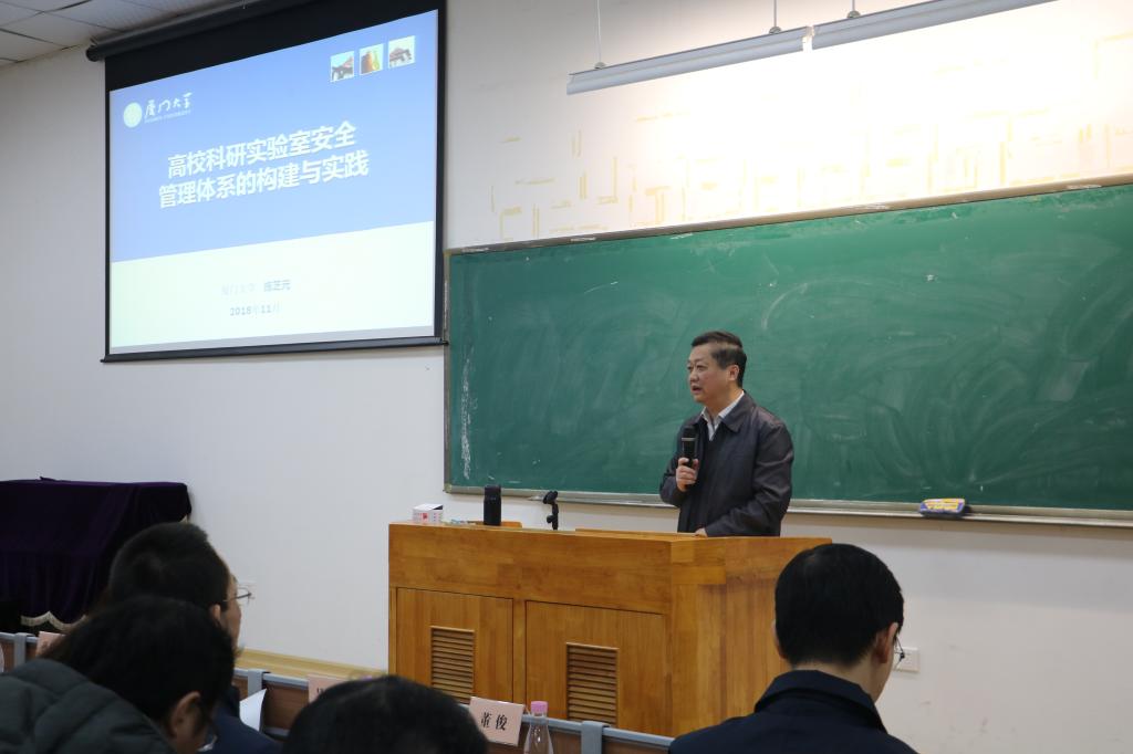 施芝元从家庭煤气安全使用案例,深入浅出地做了题为《高校实验室安全管理体系的构建与实践》的专题讲座。他认为全校各学院都应把安全工作放在战略高度来抓,安全教育不应“重形式、轻实效”,实验室安全应理清职责,特别留意实验室可能产生的任何危险源,建立科学规范的台账,认真分析安全隐患、切实做好安全保障。