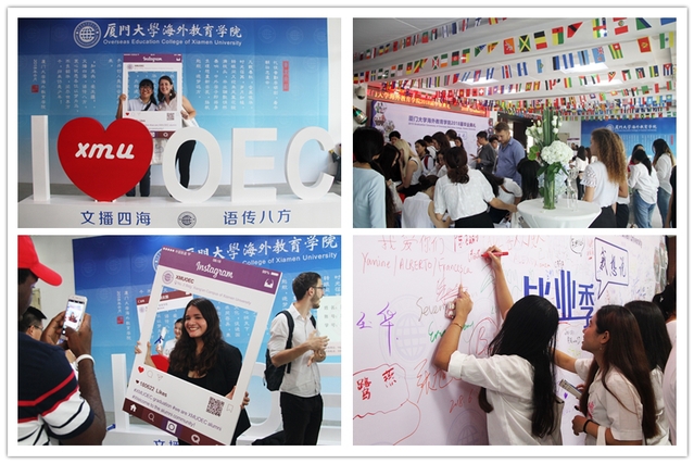 六月的骊歌再次唱响,毕业季如约而至,连绵的细雨诉说不尽学子们对母校的深情留恋。翔安校区坤銮楼一楼的海外教育学院大厅,各色鲜艳的各国小国旗在厅内飘展,展厅中央巨大的“毕业季我想说”的背板,写满了老师的祝福和中外同学的离别话语;两侧的背景墙,一面是代表学院来自五湖四海不同肤色学子的侧脸剪影,一面则以充满中国特色的立式卷轴加红色印章的毕业寄语展开,主色调则是浩瀚包容的“海外蓝”;学院大厅摆放“I❤OEC”的主题移动板,充分渲染出学子们对学校和学院不舍的温情;富有翔安校区和学院特色的各类文字纪念章,精心搭配的香槟气球,INS和微信朋友圈图框,厦小美和厦小帅的专有校园卡各类可爱有趣的道具,吸引了一拨又一拨中外毕业生的眼光,他们纷纷DIY出专属于自己的毕业影像造型;精心准备的毕业U盘和T恤,传递着学院对毕业生浓浓的关爱与期许。