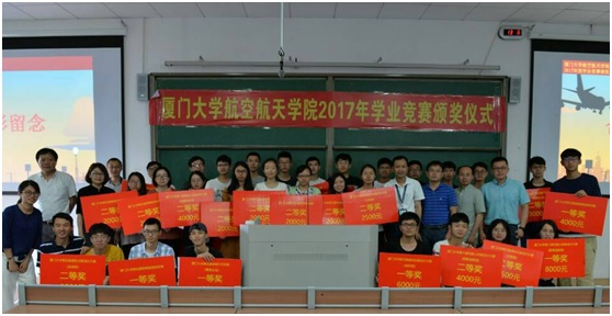 5月17日中午,厦门大学航空航天学院2017年度学业竞赛颁奖仪式于翔安校区文宣楼A401隆重举行。翔安校区党工委副书记、管委会副主任李峰,现代教育技术与实践训练中心副主任姚斌、航空航天学院党委副书记郑镇锋、航空航天学院工程中心副主任李继芳、团委书记晏振宇以及各赛事的指导老师出席本次颁奖仪式。