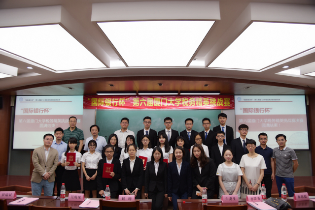 5月25日,“国际银行杯”第六届厦门大学税务精英挑战赛决赛在经济楼N302举行。决赛由厦门大学法学院教授朱炎生、厦门市国家税务局大企业和国际税务管理处副处长孙隆英、德勤中国税务总监及福建地区税务业务负责人吴焕琛、厦门毕马威税务经理罗瑞斌担任评委。经济学院财政系副主任、教授刘晔,经济学院财政系助理教授熊巍,经济学院辅导员徐慧聪、刘长青出席此次活动。