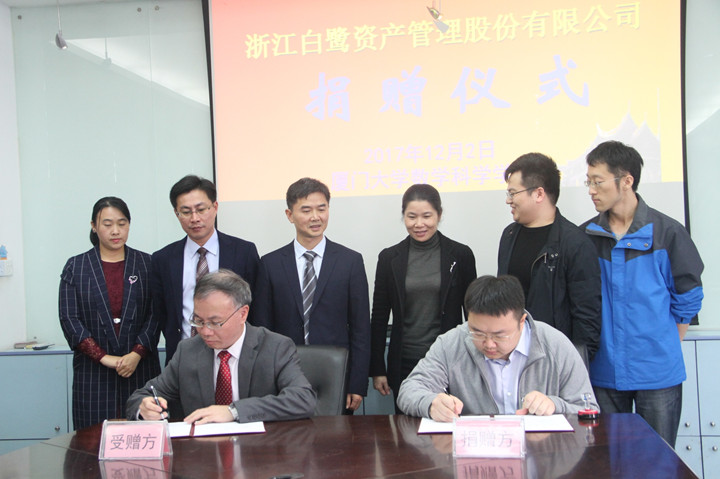 12月2日,厦门大学数学科学学院“白鹭”基金捐赠仪式在海韵园举行。数学科学学院2005级校友、浙江白鹭资产管理股份有限公司董事长兼总经理章寅先生、运营总监杨帆先生、我校校长助理、数学科学学院院长谭绍滨教授、学院党委书记张明智、副书记兼副院长张剑文教授、副书记刘宁、2005级任课教师代表、2005级校友代表李瑜博士及学院师生代表等参加了捐赠仪式,仪式由刘宁副书记主持。