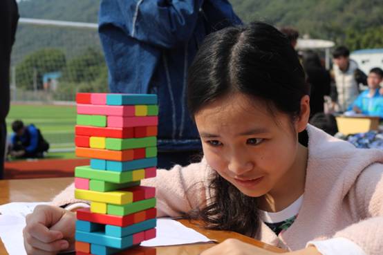 本次趣味比赛的规则采用积分制,选手们可以选择擅长的项目,完成任务即可得到积分。拆积木是一项难度和趣味性兼具的趣味游戏,规则是在积木不倒的情况下,抽出至少15根积木。如果中途积木散架,则不能获得分数。此游戏要求选手能够静下心来,找准积木的受力点。在抽出积木的时候,集中注意力、保持慢动作,让积木丝毫不颤动,否则就会全盘崩溃。看着选手们专注的眼神,我们也能感受到一丝紧张。