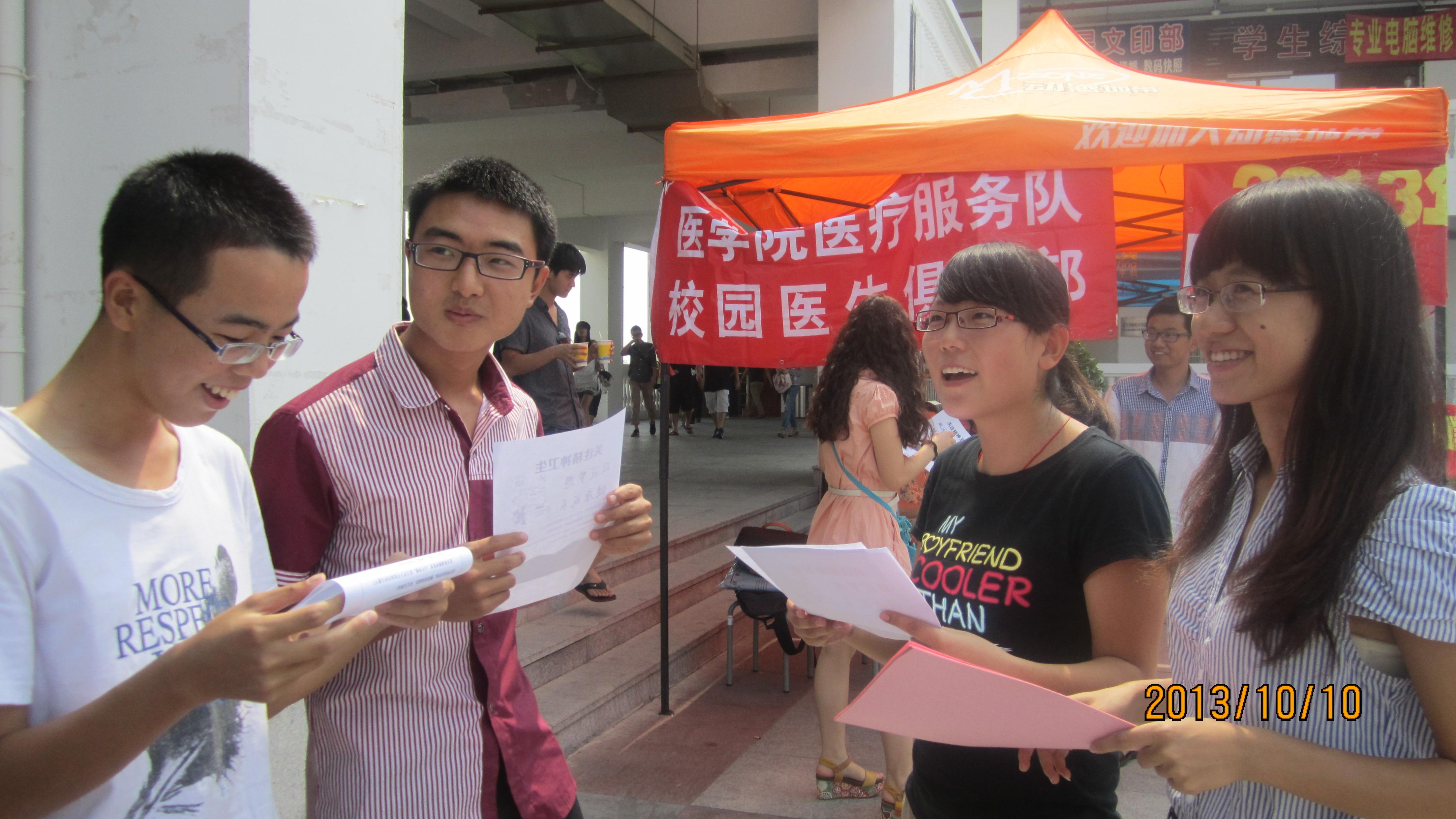 10月10日是世界精神卫生日,作为传播精神卫生理念的重要日子,在各地越来越受到重视。在这第22个世界精神卫生日,医学院校园医生俱乐部开展了以“发展事业、规范服务、维护权益”为主题的世界精神卫生日宣传咨询活动,旨在提高同学们对精神卫生问题的认识,促进对精神疾病进行更公开的讨论。