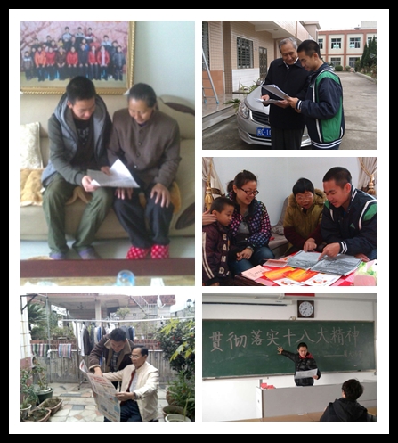 在福建和江西,方智坤等同学组成的宣讲队分别走近社区、村镇和民居,向居民、农民、公务人员和离退休老人等宣传党的十八大关于推动城乡发展一体化、统筹推进城乡社会保障体系建设、全面提高人民生活水平、扎实推进社会主义文化强国建设、大力推进生态文明建设、建设美丽中国等方面政策。大家反响热烈,纷纷结合自身的工作和生活经历,介绍了近年来经济发展、社会和谐的新气象,例如农村医保享受68%的报销优惠、数字电视普及带来丰富多彩的文化节目、村集体发起“家园清洁活动”等环保工程、基层民警以实际行动践行“为人民服务”宗旨等;同时就共同关注的收入、物价、房价等话题展开交流,希望在全面建成小康社会的进程中,老百姓的日子能过得越来越红火、越来越有盼头。