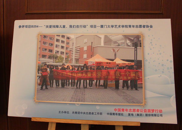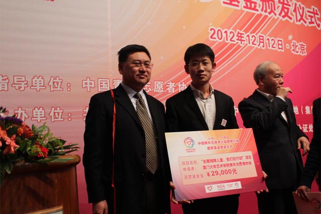 12月12日,由共青团中央志愿者工作部、中国青年报社和复地集团,共同发起举办的“中国青年志愿者公益圆梦行动”圆梦基金仪式在北京举行。厦门大学艺术学院“关爱残障儿童,我们在行动”以优秀的项目入围圆梦行动,江雨航同学作为学生代表上台签署圆梦基金承诺书,并接受共青团中央志愿者工作部部长郭美荐颁发的圆梦基金。
