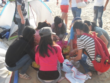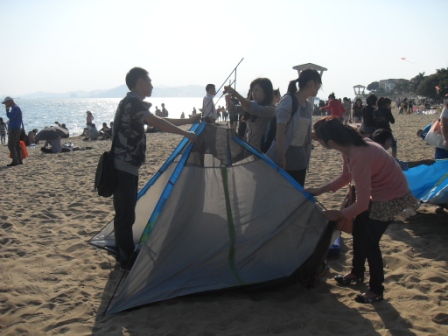 此次活动筹备充分,文娱部事先租借好了数顶帐篷,可谓是别出心裁、准备周到。伴着舒适的海风、明媚的阳光,大家齐心协力,一顶顶色彩艳丽的帐篷便出现在了沙滩上。脚踩细白的沙石,耳听动人的涛声,大家沉浸在一片欢声笑语中。