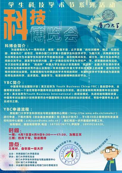 为迎接我校九十一周年校庆,展现“自强不息,止于至善”的校训精神,响应“和谐校园,青春先行”的号召,特举办厦门大学第十四届学生科技学术节。学生科技学术节作为厦大校园内极具分量的学生科技学术活动,将进一步激发学生创新能力,繁荣校园文化,营造充满创新活力的校园氛围。
