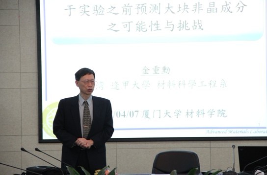 为了进一步加强两岸在新材料研究领域的交流合作,2012年4月7日上午,两岸材料学界的群贤们相聚颂恩楼215举行了题为“于实验之前预测大块非晶成分之可能性与挑战”的海峡两岸新材料专题论坛。会议紧紧围绕大块非晶材料(BMG),邀请了我国新材料一流科学家、新材料产业精英,就当前大块非晶材料发展的一些热点和关键问题分别作专题报告并开展深入研讨。此次论坛由海峡两岸新材料科技发展中心主办,厦门大学材料学院和北京科技大学新金属材料国家重点实验室共同承办。