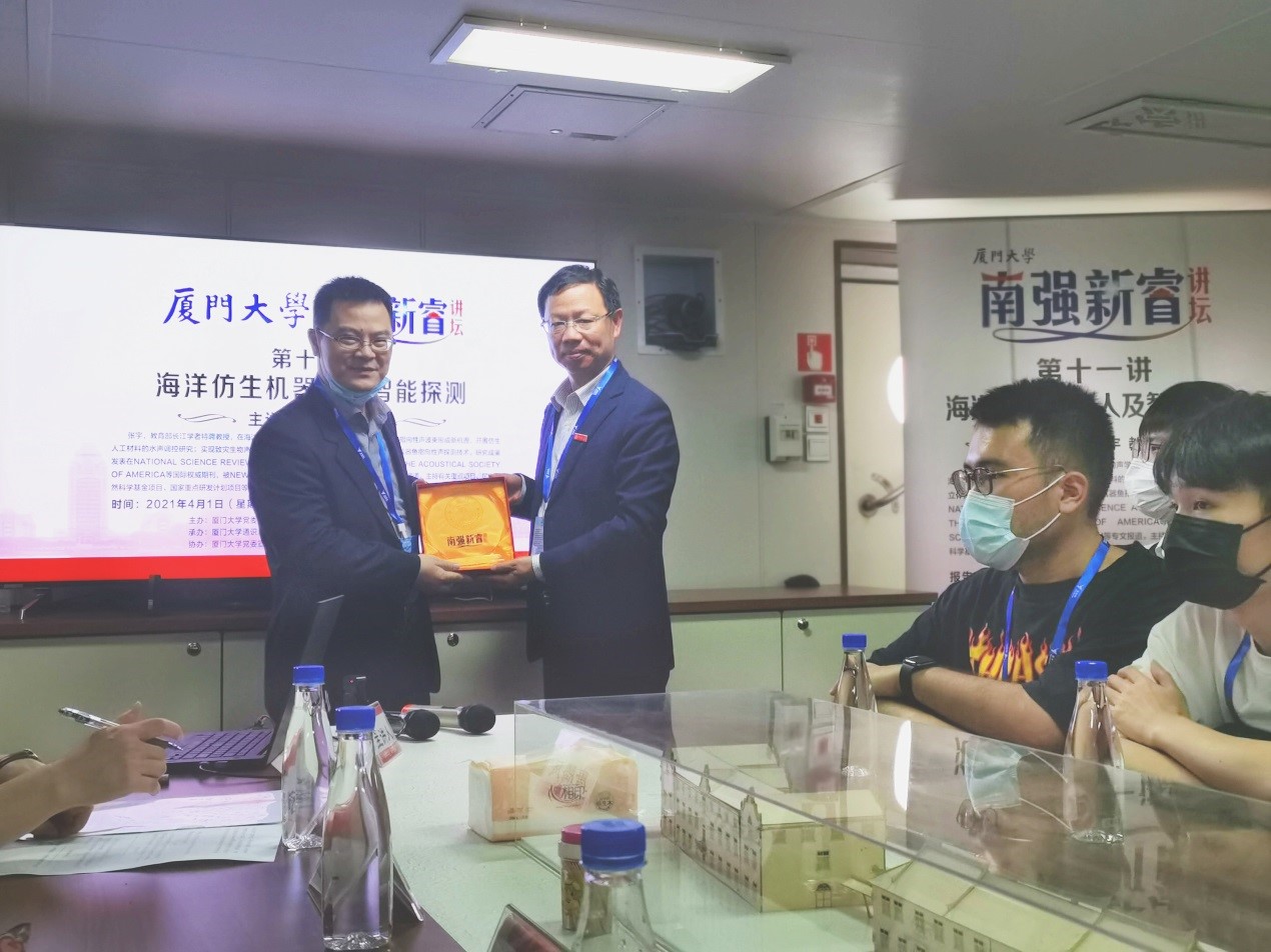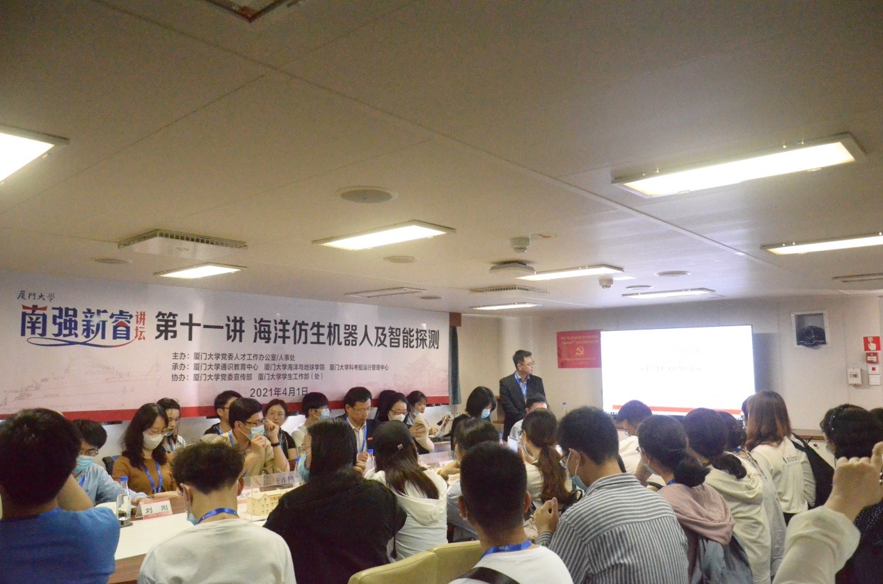 在厦门大学即将迎来百年校庆之际,4月1日下午,来自全校15个学院的30余名学生代表通过易班抢票,幸运地登上“海上厦大”——“嘉庚”号海洋科考船,共同参加南强新睿讲坛第十一讲。教育部长江学者特聘教授、厦门大学海洋与地球学院张宇教授应邀作题为《海洋仿生机器人及智能探测》的专题讲座。
