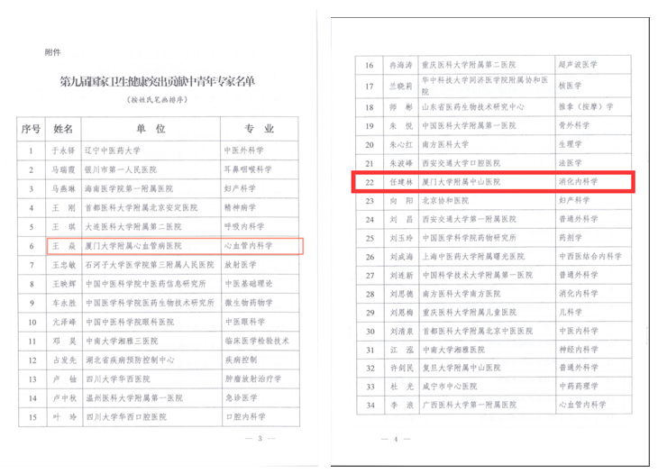 近日,国家卫生健康委员会、国家中医药管理局发布通知,公布第九届国家卫生健康突出贡献中青年专家选拔结果,厦门大学附属心血管病医院王焱教授、厦门大学附属中山医院任建林教授获此殊荣。