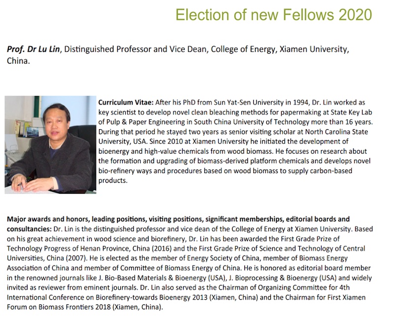 近日,国际木材科学院(International Academy of Wood Science, IAWS)公布了2020年院士(Fellow)增选名单,我校能源学院林鹿教授被推荐入选。这是厦门大学科研人员首次入选国际木材科学院院士,标志着我校林鹿教授及其团队在林木资源与生物质利用领域的突出成果获得国内外同行高度认可。