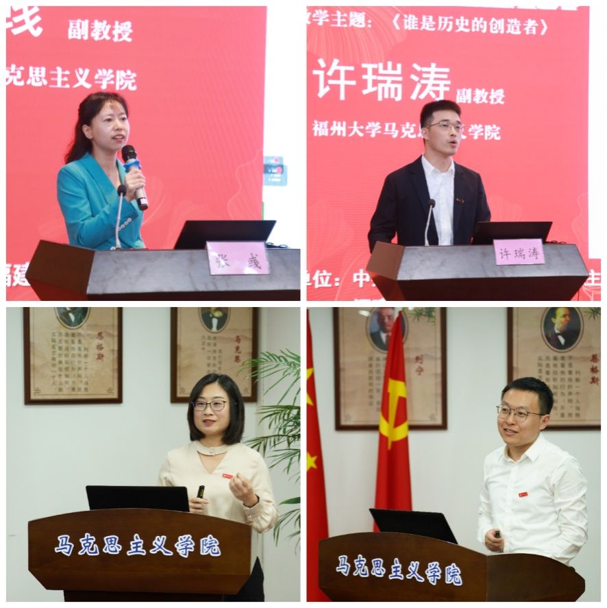 在教学展示环节中,来自福州大学、厦门大学马克思主义学院的四位青年教师依次登台展示。福州大学张彧副教授聚焦“百年大党的红色气质”,以克莱恩国力方程引出“精神国力”的重要性,带领师生探析“精神”内涵及中国共产党人的精神谱系。福州大学许瑞涛副教授以“谁是历史的创造者”为主题,从“立场之问”“主体之问”和“方法之问”切入,引导学生循序渐进地得出“人民是历史的创造者”这一结论。厦门大学庄三红副教授就“深化供给侧结构性改革”主题,结合“十大扩消费行动”案例,深入浅出地阐释了当前供给侧结构性改革的实质,进一步廓清了中国供给侧结构性改革不同于西方供给学派改革的本质区别。厦门大学贾凯副教授以《觉醒年代》导入“觉醒青年与中国工人运动的紧密结合”这一教学主题,层层递进地讲授觉醒青年与工人克服重重困难,逐步建立起全国性联系,工人阶级力量得以壮大的历史过程。