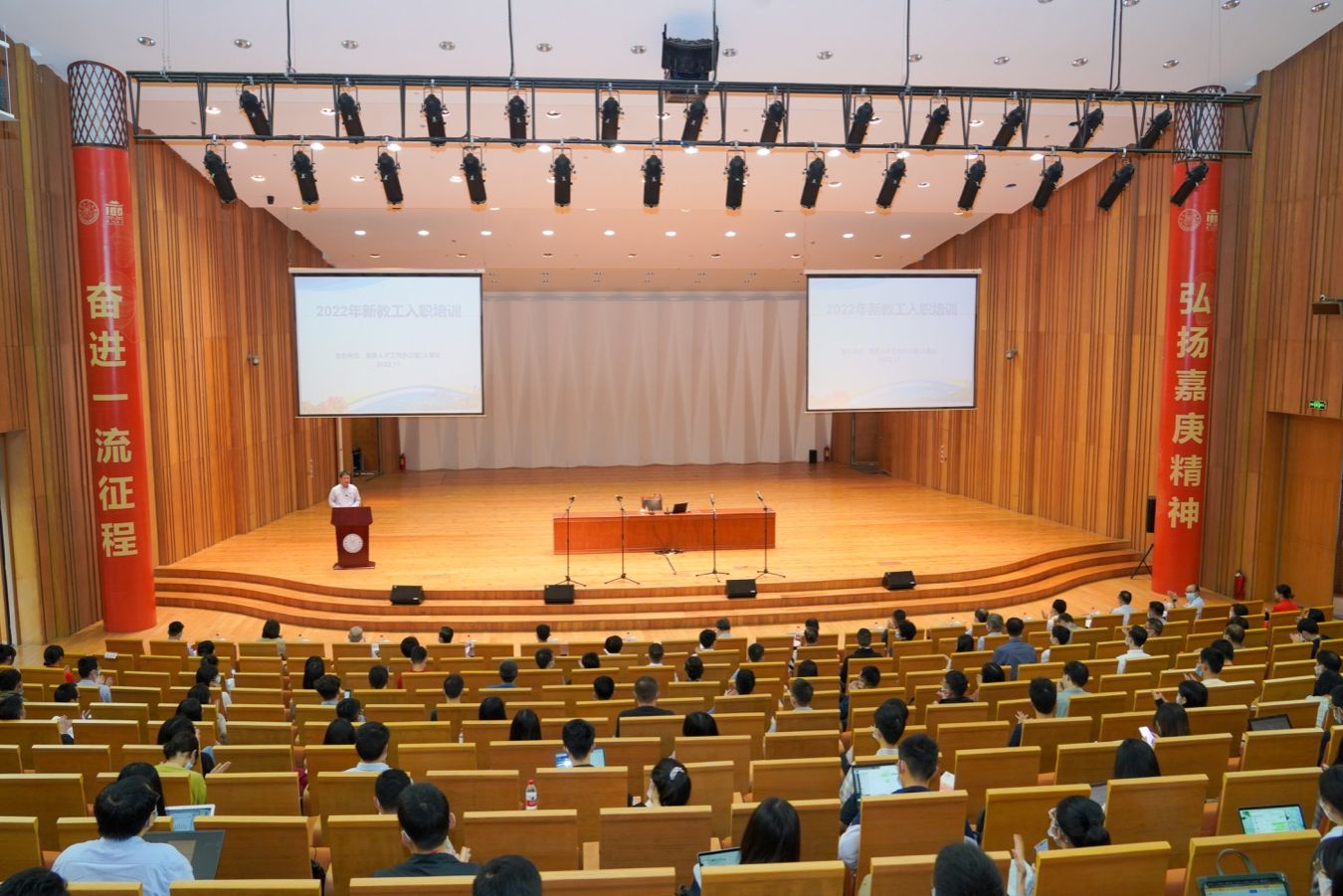 “自强!自强!学海何洋洋!”在激情昂扬的校歌声中,11月14日上午,2022年新教工入职培训开班仪式在科艺中心举办。校党委书记张荣出席并作首场专题报告。副校长江云宝主持仪式。学校相关部门负责人、荣休教工代表及150余名新教工参加。