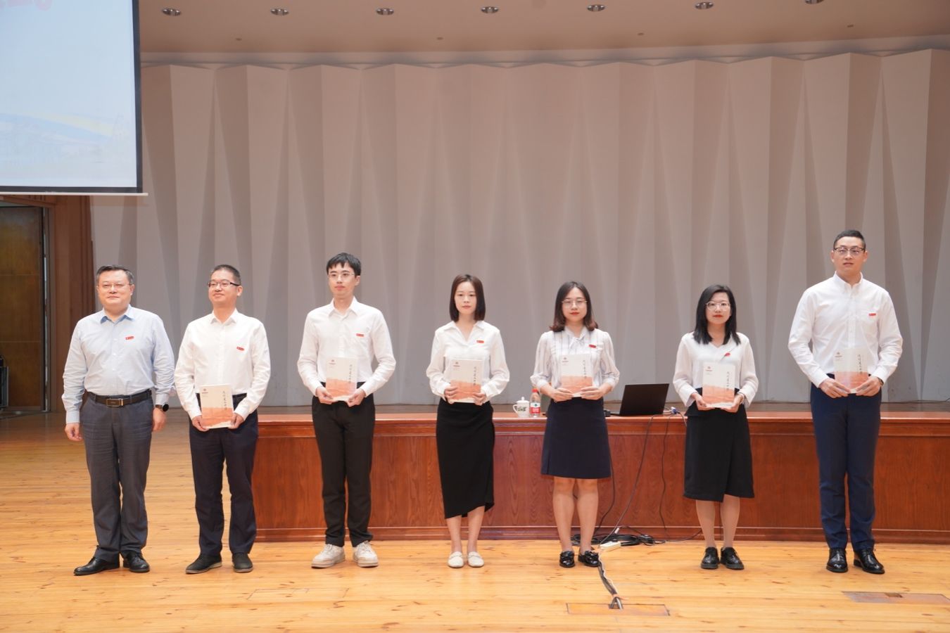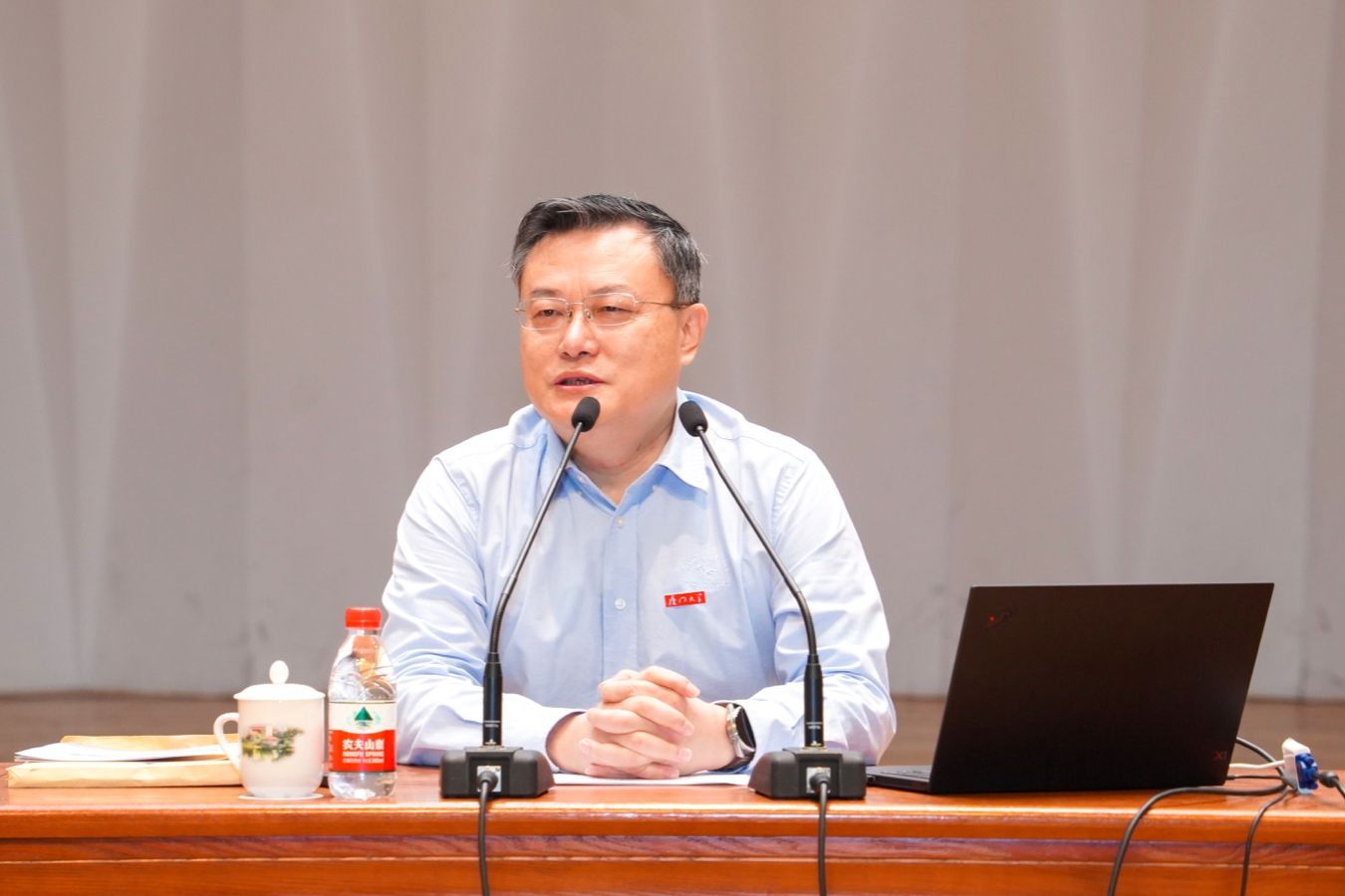 张荣为新教工代表佩戴校徽,并赠送《我的厦大老师》一书。近年来,学校把书籍《我的厦大老师》作为送给新教工的“见面礼”,希望新教工更好了解厦大文化,传承厦大精神,弘扬高尚师德,争做“四有”好老师,做好“四个引路人”,为学校事业的高质量发展赓续奋斗。