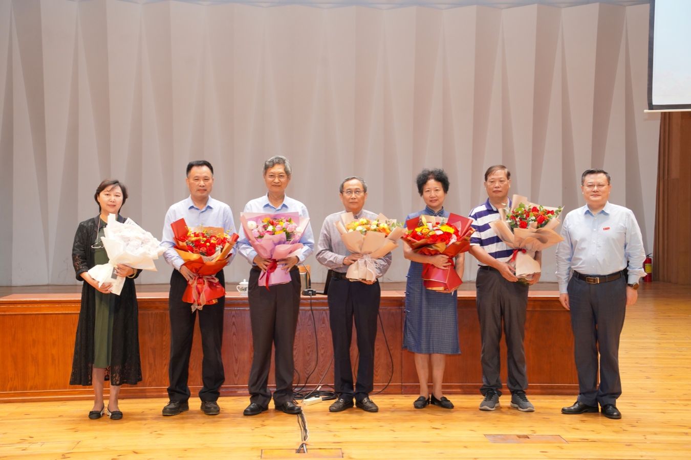 在欣赏完艺术学院男声合唱《不忘初心》后,新教工代表向今年的荣休教工代表献上鲜花,并送上对荣休教工们的敬意和祝福。