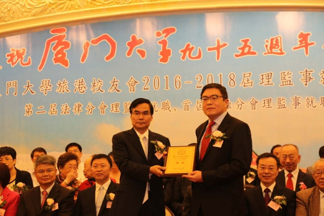 我校副校长杨斌,香港校友会新任理事长方平,香港厦门联谊总会前任理事长、我校香港校友会荣誉会长王少华,香港中联办教育科技部副巡视员刘志明,香港福建社团联会荣誉主席林广兆,香港校友会2014-2016届理事长徐兰芳,香港校友会新任监事长周韬,香港校友会首任金融分会会长陈少杰以及各界校友700余人出席并参加了本次庆祝我校95周年华诞和香港校友会新一届理监事就职典礼。
