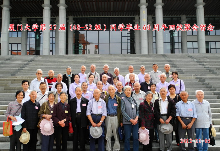厦门大学第27届(1948-1952级)同学毕业60周年聚会,于2012年11月5-8日在厦门举行。30位同学分别来自北京、上海、南京、武汉、太原、合肥、杭州、黄岩 和 福、厦、漳、泉、莆等城市。我们都是汪德耀、王亚南校长年代的学子,相见欢啊!还有14位学长们的亲属也参与盛会。