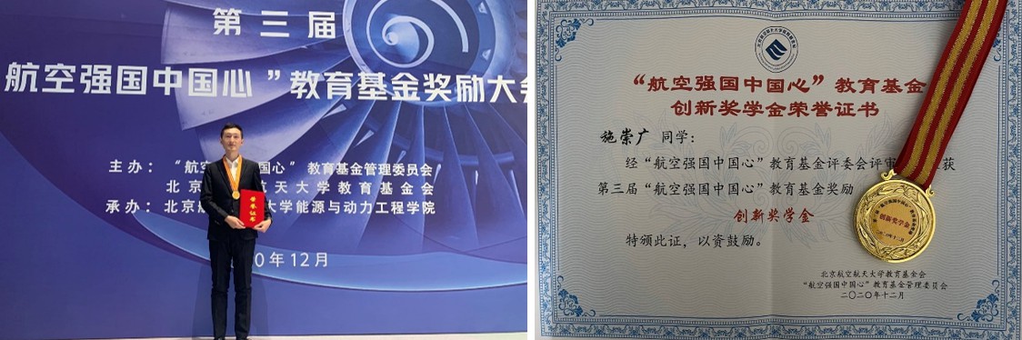 12月13日上午,第三届“航空强国中国心”教育基金评选活动颁奖仪式在北京举行,航空航天学院2017级博士生施崇广获此殊荣。