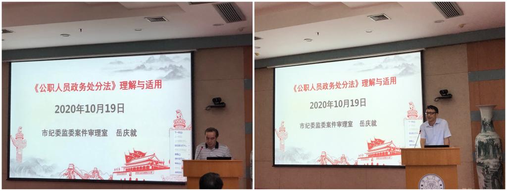 10月19日下午,全校纪检监察干部专题业务培训在颂恩楼220报告厅举行,邀请厦门市纪委监委案件审理室岳庆就副主任作题为《<公职人员政务处分法>的理解与适用》的专题报告。校党委副书记、纪委书记全海出席。校纪委副书记、纪委办主任、巡察办主任林金枝主持。