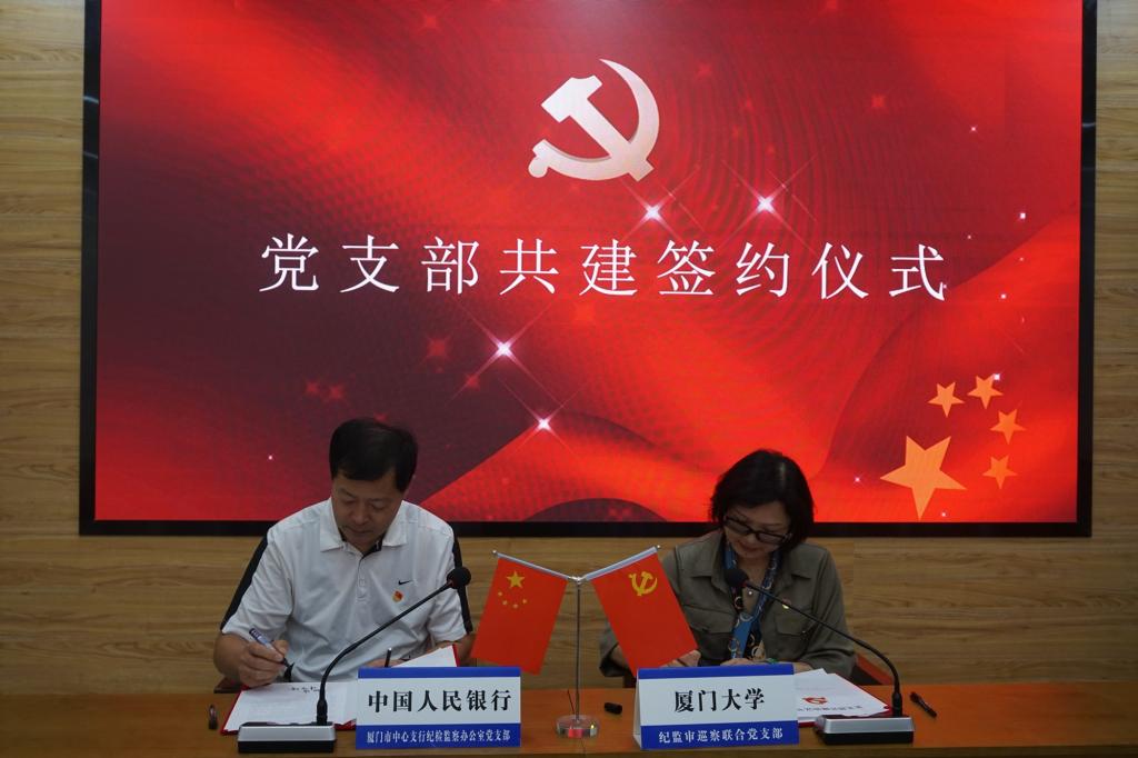 在高山党校总部,厦门大学纪监审巡察联合党支部与中国人民银行厦门市中心支行纪检监察办公室党支部举行了党支部结对共建签约仪式,由双方党支部书记共同签订了《党支部共建协议书》。双方约定,通过“组织联建、队伍联育、资源联享、发展联推”的共建形式,形成“共建组织、共抓队伍、共享资源、共谋发展”的党支部建设新格局,促进双方党支部党建工作和业务全面合作。