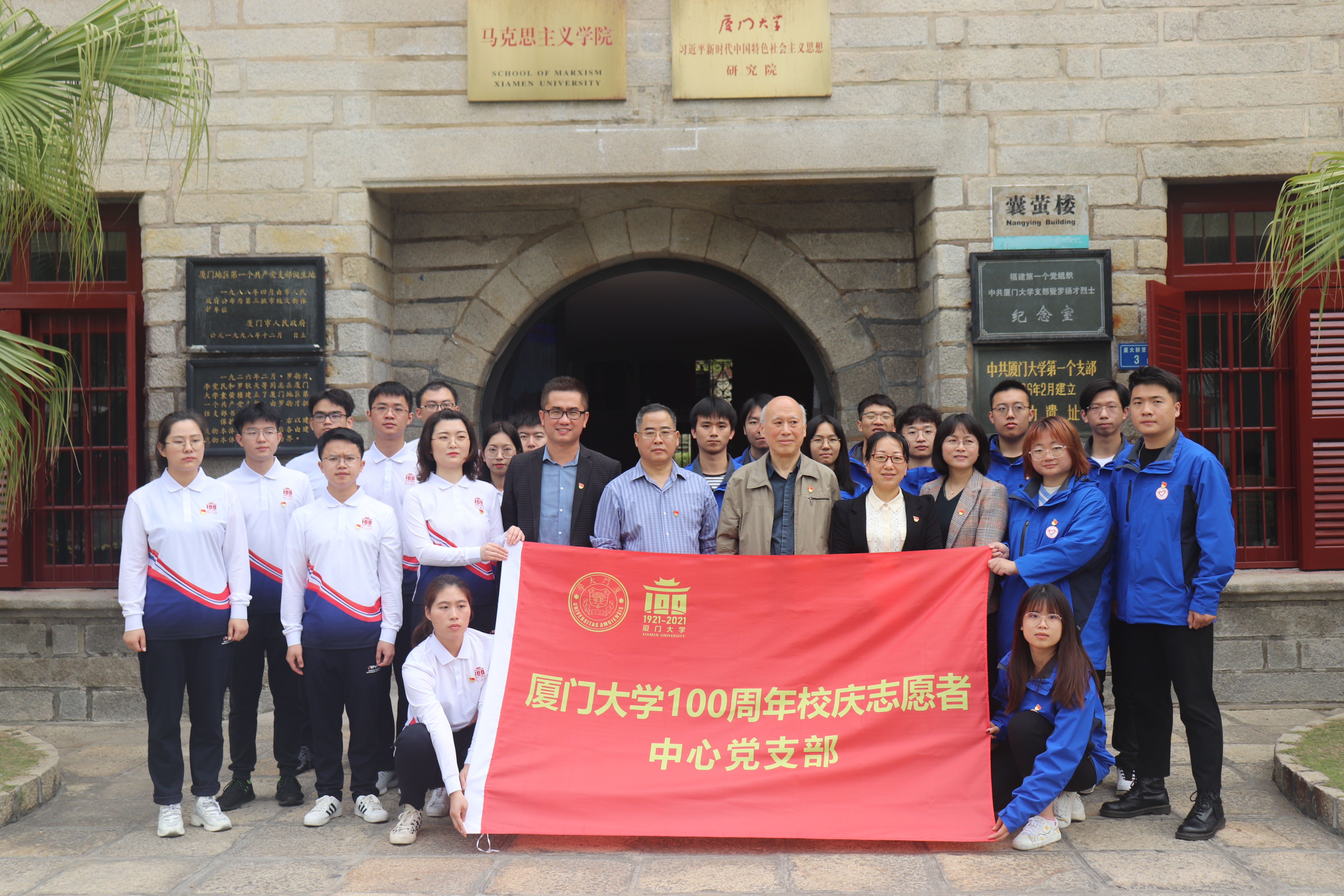 会上,王炳华宣读了《关于同意成立厦门大学百年校庆志愿者中心党支部的批复》并为中心党支部授旗,颜章炮、廖志丹共同为百年校庆志愿者中心党支部揭牌,梁振伟为志愿者代表颁发了百年校庆志愿者录取通知书。与会党员还齐聚囊萤楼前举行重温入党誓词仪式,在党旗下作出庄严的承诺。