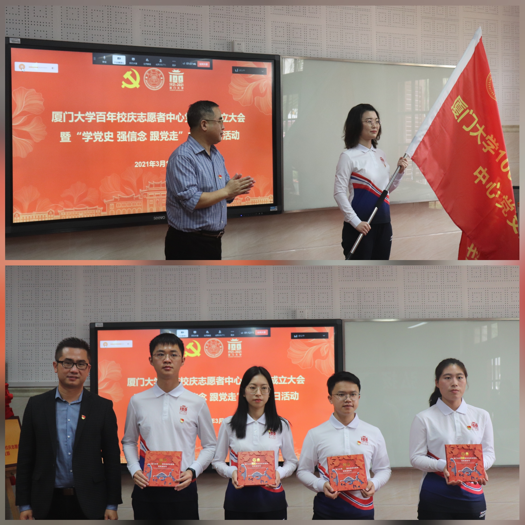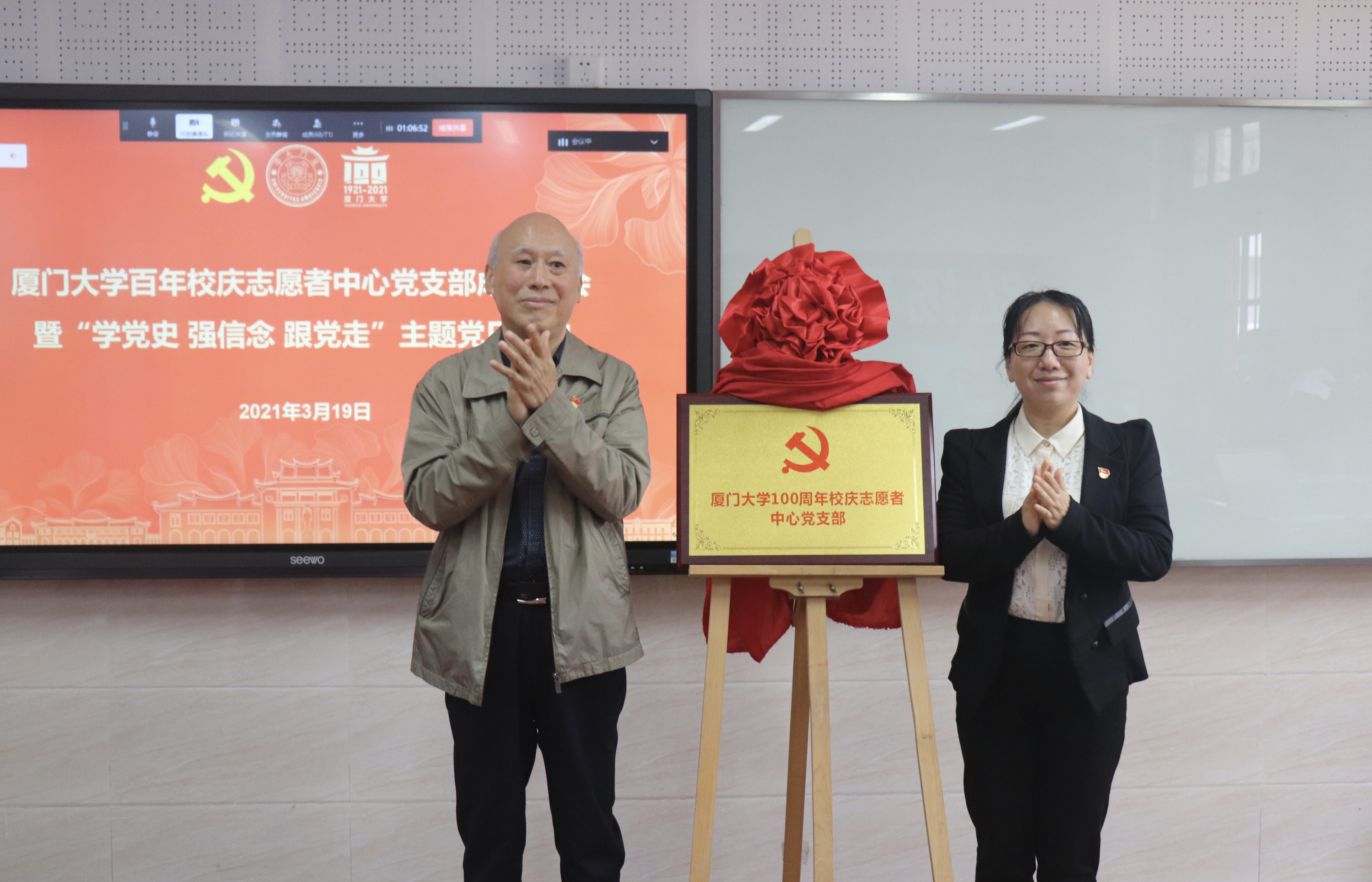 3月19日上午,厦门大学百年校庆志愿者中心党支部成立仪式暨“学党史 强信念 跟党走”主题党日活动在囊萤楼112举行。校关工委副主任颜章炮,校党建办主任、党委组织部副部长廖志丹,机关党委书记王炳华及30名党员代表出席大会,其他党员通过线上直播方式参加。会议由校团委副书记梁振伟主持。
