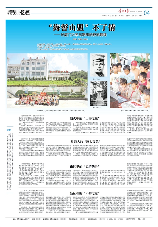 “志合者,不以山海为远。”从母校创办初期的5名黔籍学子前来求学,到现如今厦大对贵州的对口支援与校地合作,无论是战火中的“山海之缘”、贵师大的“厦大智慧”,还是新征程的“不解之缘”,我们从中读到的不仅仅是情深谊长与“海誓山盟”,更是我们党“志之所趋,无远弗届”,更是“打赢脱贫攻坚战,全面小康路上,一个都不能少”的庄严承诺。