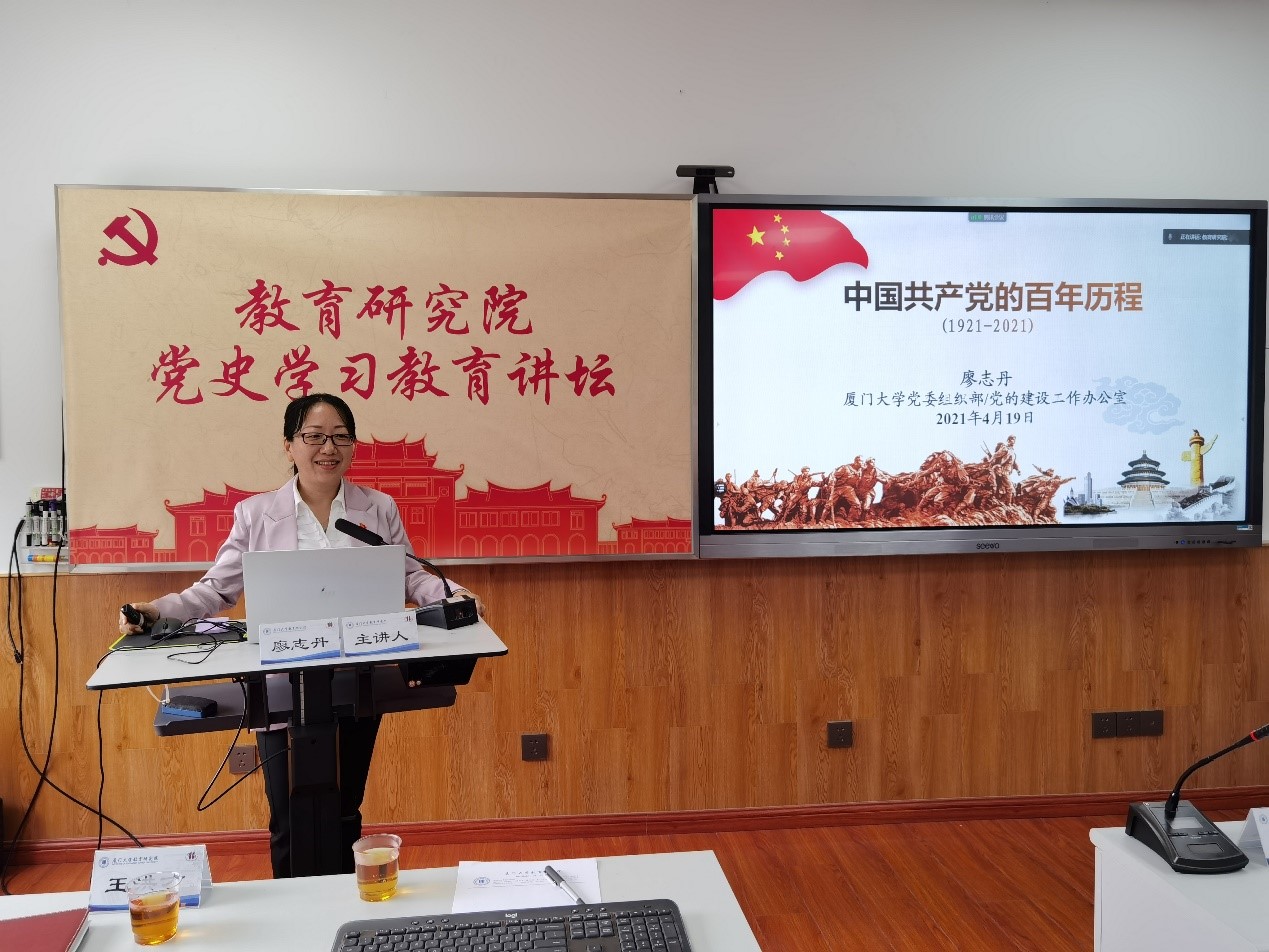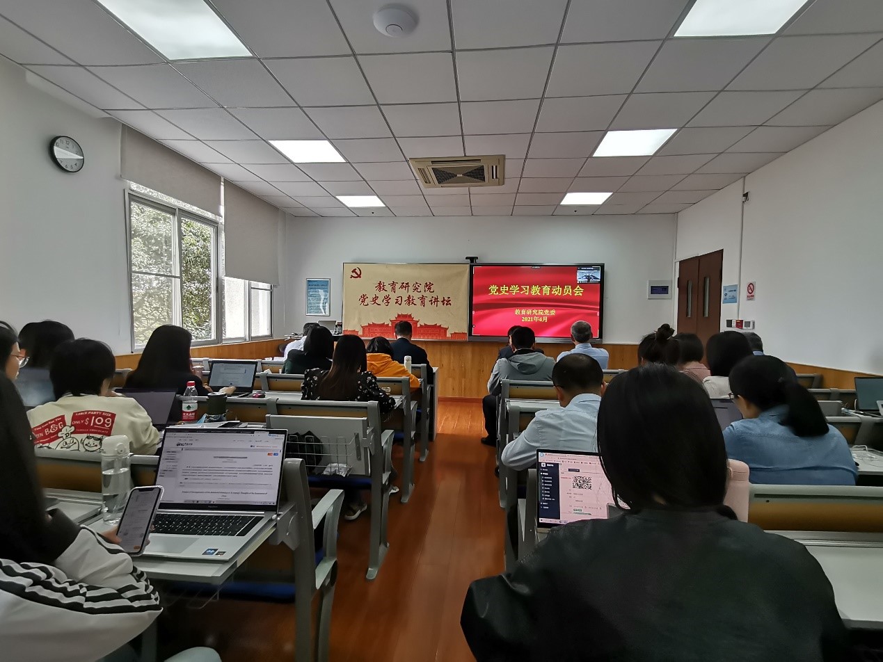 以史为镜,学思践悟。为深入贯彻习近平总书记在党史学习教育动员大会上的讲话精神,4月19日下午,在教育研究院201报告室,教育研究院党史学习教育讲坛“开讲啦”!作为系列讲座之一,校党委党建办主任兼组织部副部长、教师工作部副部长廖志丹副教授受邀作论坛首讲。论坛由研究院党委书记刘振天主持,校党委组织部副部长乔连全,研究院党政领导班子成员以及全院师生参加讲坛。