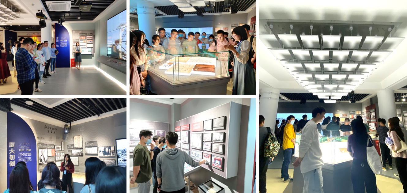 修缮后的革命史馆与校史馆,以新时代的眼光和当代人的视角重新回顾、梳理厦门大学的革命史与百年校史,并充分运用嘉庚建筑、厦大蓝、嘉庚红等厦大视觉元素,形成厦大专属的展陈格调,以时间为线索,纵向展现了厦大革命史、百年办学历史和辉煌成就。群贤楼诉说着曲折光辉的校史展览馆中,生动的史实、绚丽的灯光秀、振奋人心的音频,党员们共同回顾了百年来厦大艰难曲折的办学历程与新时代的跨越式发展,跨时空感悟厦大历代先贤在长期求真、求知的风雨历程中形成的“四种精神”:以陈嘉庚先生为代表的爱国精神、以罗扬才烈士为代表的革命精神、以萨本栋校长为代表的艰苦办学的自强精神、以王亚南校长和陈景润教授为代表的科学精神。修缮改造后的革命史馆与校史馆,既加深了历史沉淀,又增添了时代气息,以更高远的立意、更完整的内容、更动人的形式,展示了厦大的百年风雨、百年奋斗、百年辉煌!