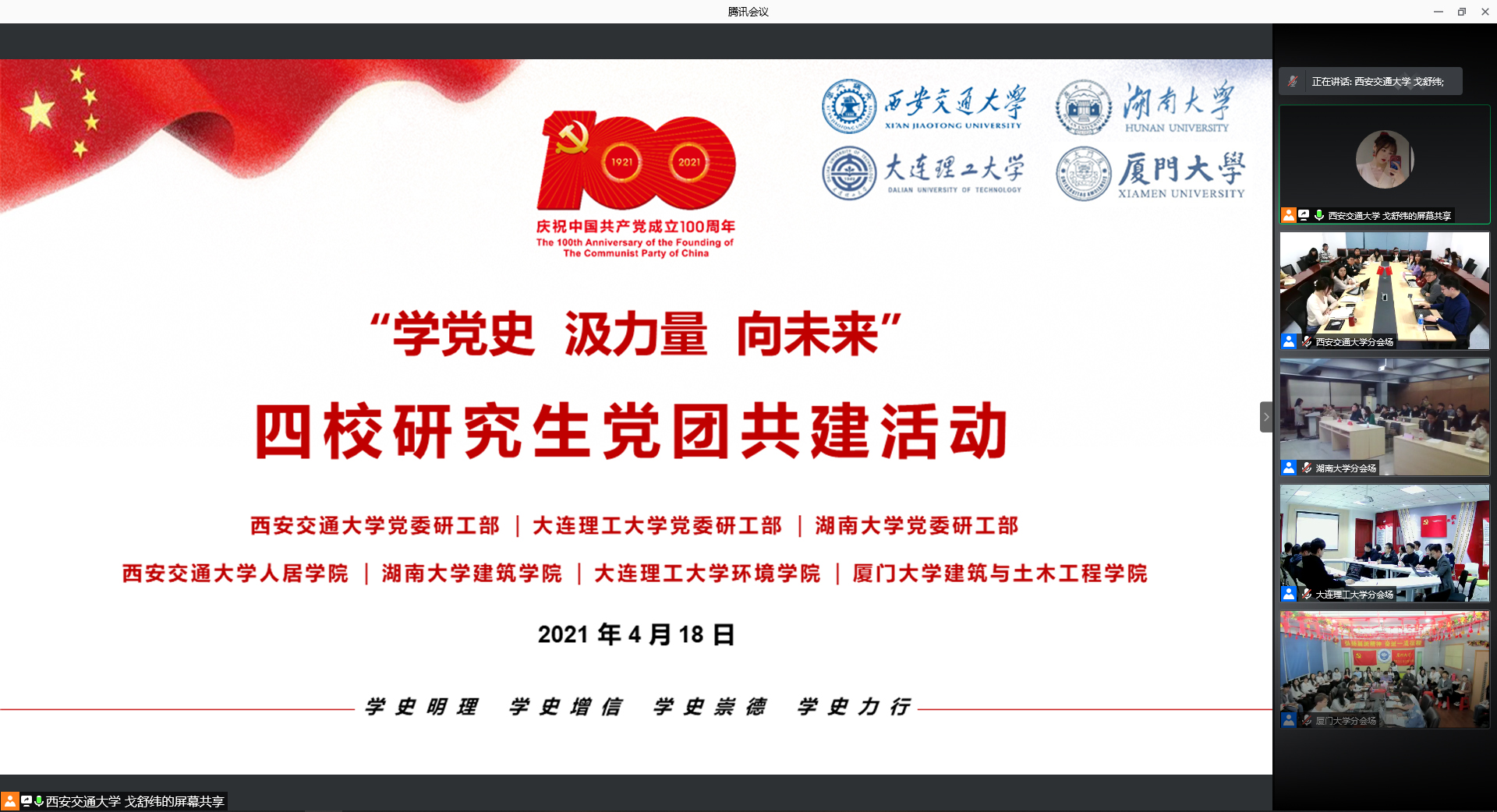 为深入学习贯彻习近平总书记在党史学习教育动员大会上的重要讲话精神和习近平总书记致厦门大学建校100周年贺信精神,重温总书记闽、湘、陕考察重要讲话精神,4月18日,建筑与土木工程学院联合西安交通大学、大连理工大学、湖南大学的相关学院,共同开展“学党史、汲力量、向未来”研究生党史学习教育,各校博士生宣讲团进行主题宣讲,来自四校的百余名研究生党团员线上线下深入交流探讨,启迪思想,激发党史学习新动能。