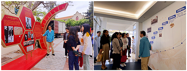 嘉庚像前合影留念后,学报(自然版)党支部、国重室党支部、结构化学党支部一行党员来到我院卢嘉锡楼前的“厦门大学化学学科百年文化展”,并在国重室教授级高工周勇亮老师生动风趣的讲解下深入了解了我院化学学科的百年发展历程,了解了固体表面物理化学国家重点实验室的建设、发展历程及取得的一系列突出成果,特别是“敢为先,重细节,合为贵”的内涵让党员们深刻的体会到了优秀文化传承对团队长期发展的重要意义。