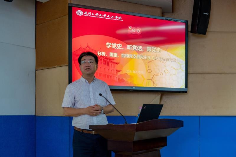 为深入贯彻和扎实推进党史学习教育,深刻领会习近平总书记致厦门大学建校100周年的贺信精神,进一步增强基层党组织的凝聚力,以更奋发昂扬的姿态迎接建党100周年,5月8日上午,化学化工学院分析科学研究所教工支部、国重室党支部、结构化学教工党支部联合开展了“学党史、听党话、跟党走”党史学习教育。校党委常委、副校长江云宝教授应邀出席并讲授专题党课。