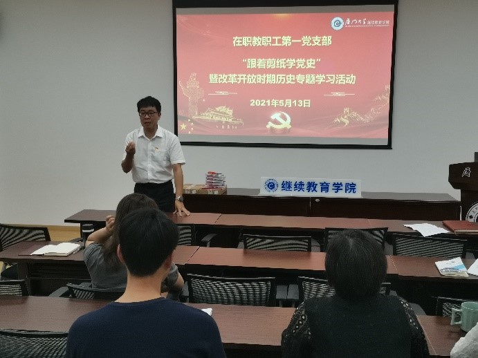 党史铸魂,文化润院。为进一步推动党史学习教育走深走实,5月13日,在继续教育学院党总支统一组织下,在职教职工第一党支部开展“跟着剪纸学党史”暨改革开放时期历史专题学习活动。此次活动共分为“学党史”“讲故事”“做剪纸”三个环节,将中国传统剪纸文化与党史学习教育相融合,旨在不断创新党员教育形式,教育引导党员在党史学习教育中不断坚定文化自信。