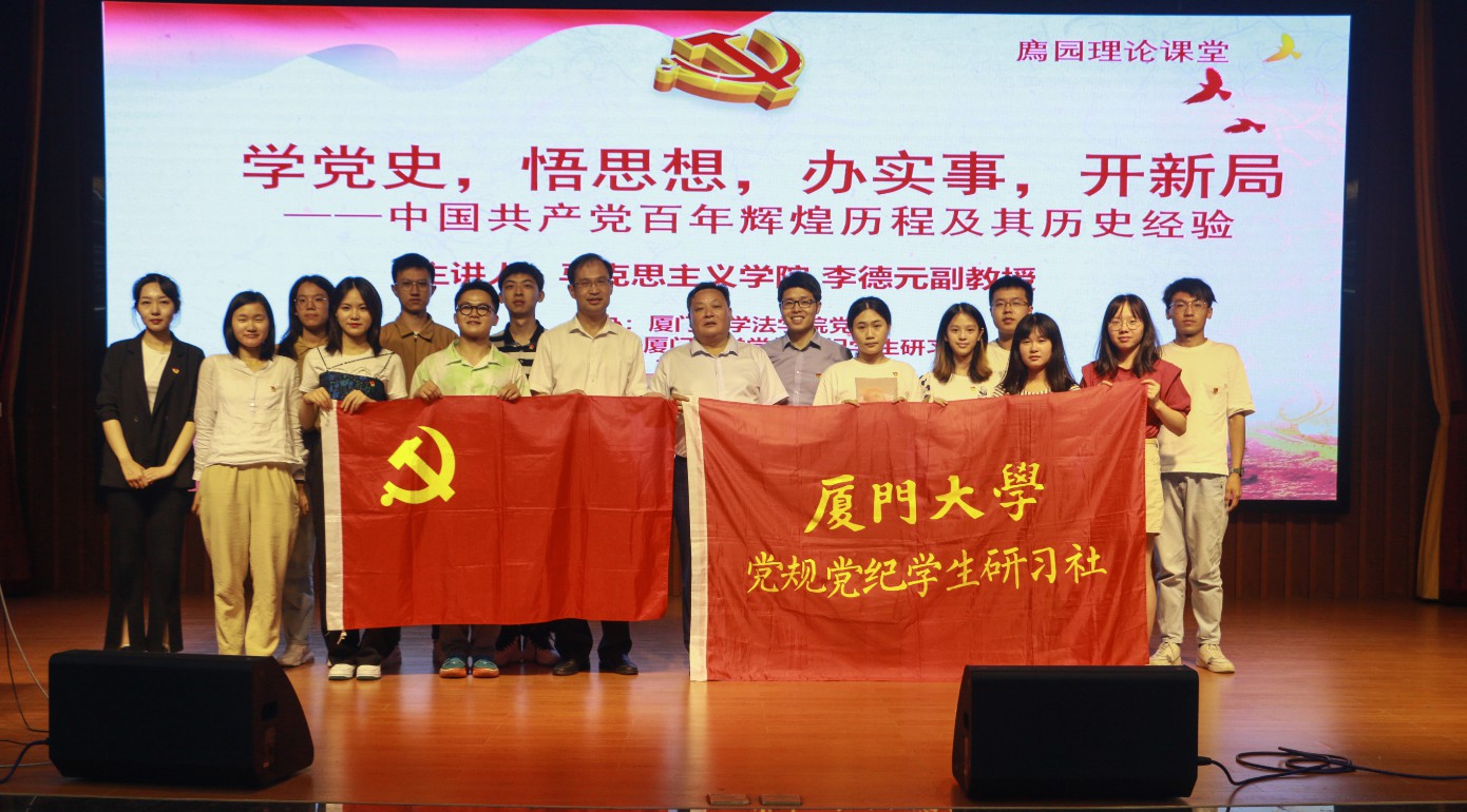 学史明理、学史增信、学史崇德、学史力行。为扎实推进党史学习教育,坚定信仰,以知促行,5月10日晚,学院在模拟法庭举办“中国共产党百年辉煌历程及其历史经验”专题党课。专题党课由法学院党委主办、厦门大学党规党纪学生研习社党支部承办,马克思主义学院李德元副教授担任主讲人,法学院党委副书记郭锦星和全体研究生党员共同聆听这场专题党课。