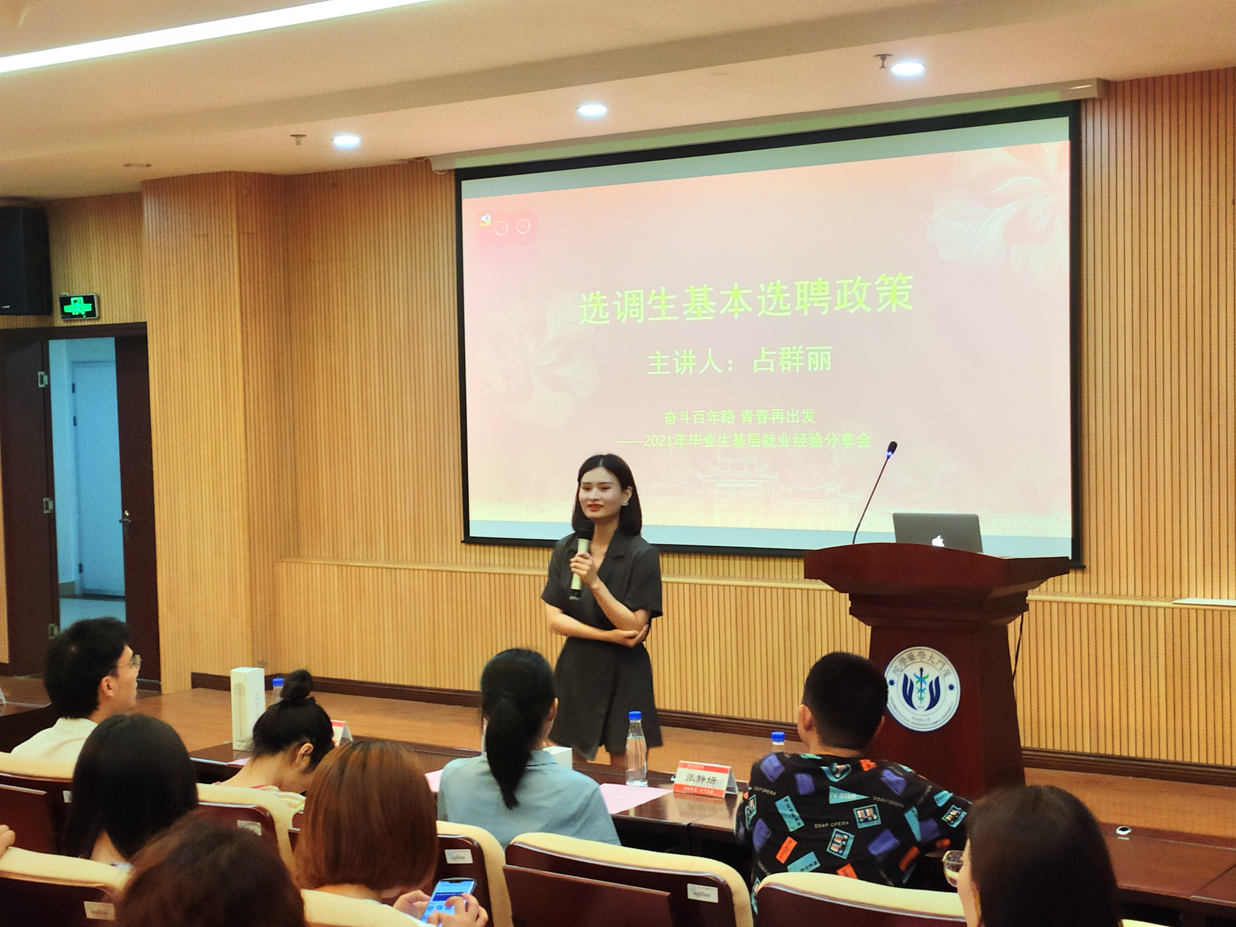 药学院毕业生代表土家族学生张雪梅和毛南族学生谭鸣分别分享了自己选择回家乡工作、报考选调生的心路历程以及参加选调生考试的备考之路。