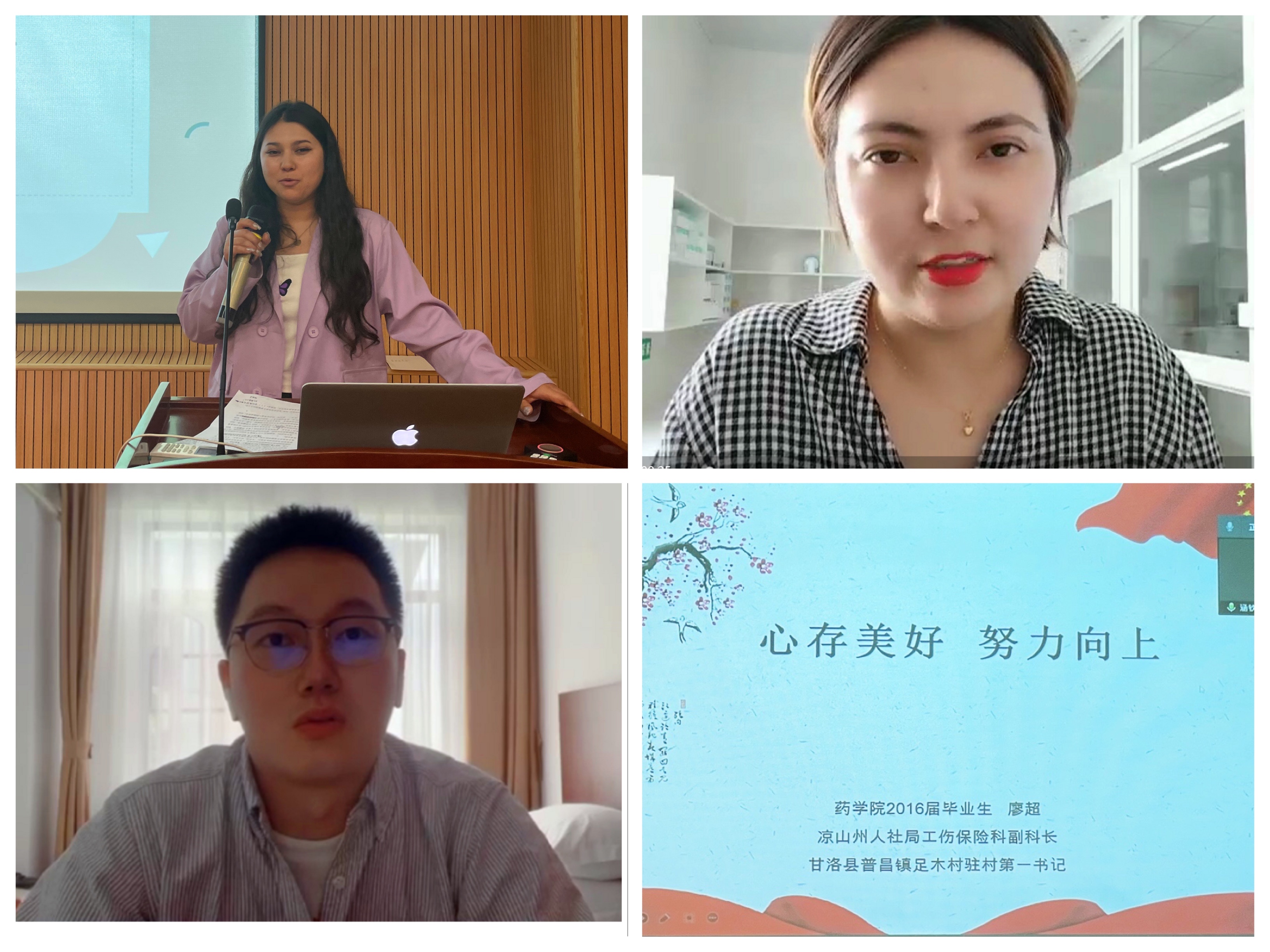 药学院校友代表王晓垚、廖超、拉扎提·甫拉提、努尔斯曼古丽·阿布都艾尼通过视频连线等形式参与分享和讨论。