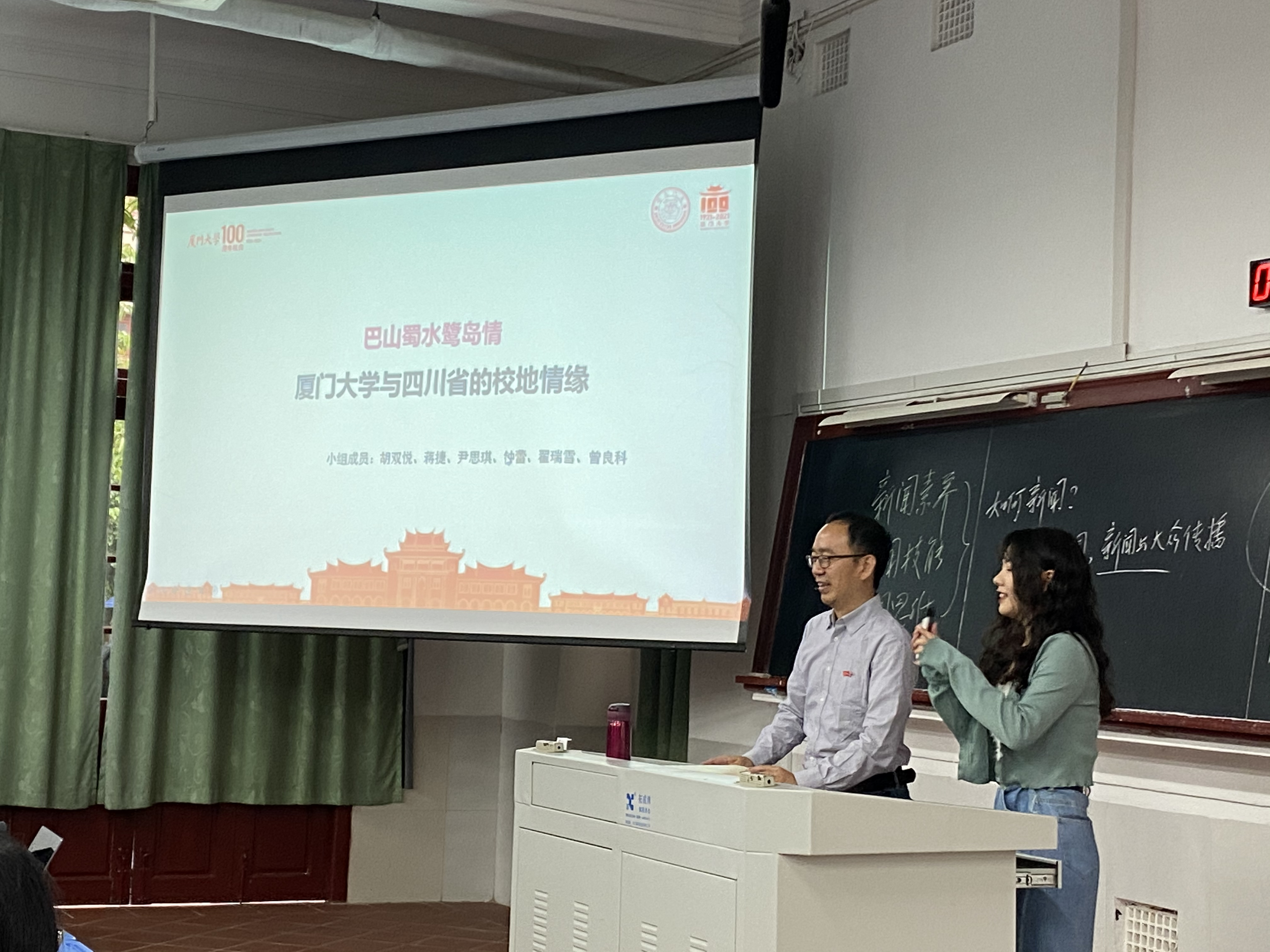 “读了这篇报道,深受感动,我在想也许在不久的将来,我也能够像这些厦大的前辈那样,为吾国放一异彩”,4月28日,学院课程《史论精解——新闻》开讲,来自云南、浙江、山西、江西、河南、四川、山东、上海、台湾等9个省份的学生代表对报道进行分析讲述。授课教师,学院副院长苏俊斌认为:“采用‘为吾国放一异彩’系列报道作为现实教材开展课程思政,其目的是将专业教育与党史教育紧密结合,启发学生加深理解新闻传播的社会责任”。受邀听课的学院党委书记曾铮表示:“校地情缘系列报道在厦大四种精神传承和百年校史传播方面做出了卓越贡献,展现了新闻的专业性和鲜活性的统一,是新闻传播专业 ‘最好的最生动的教材’,新传学子要坚持以马克思主义新闻观为指导,努力学习,练好‘脚力、眼力、笔力、脑力’,到基层实践‘大熔炉’里经磨砺、受锤炼,成长为一名优秀的新闻工作者。”