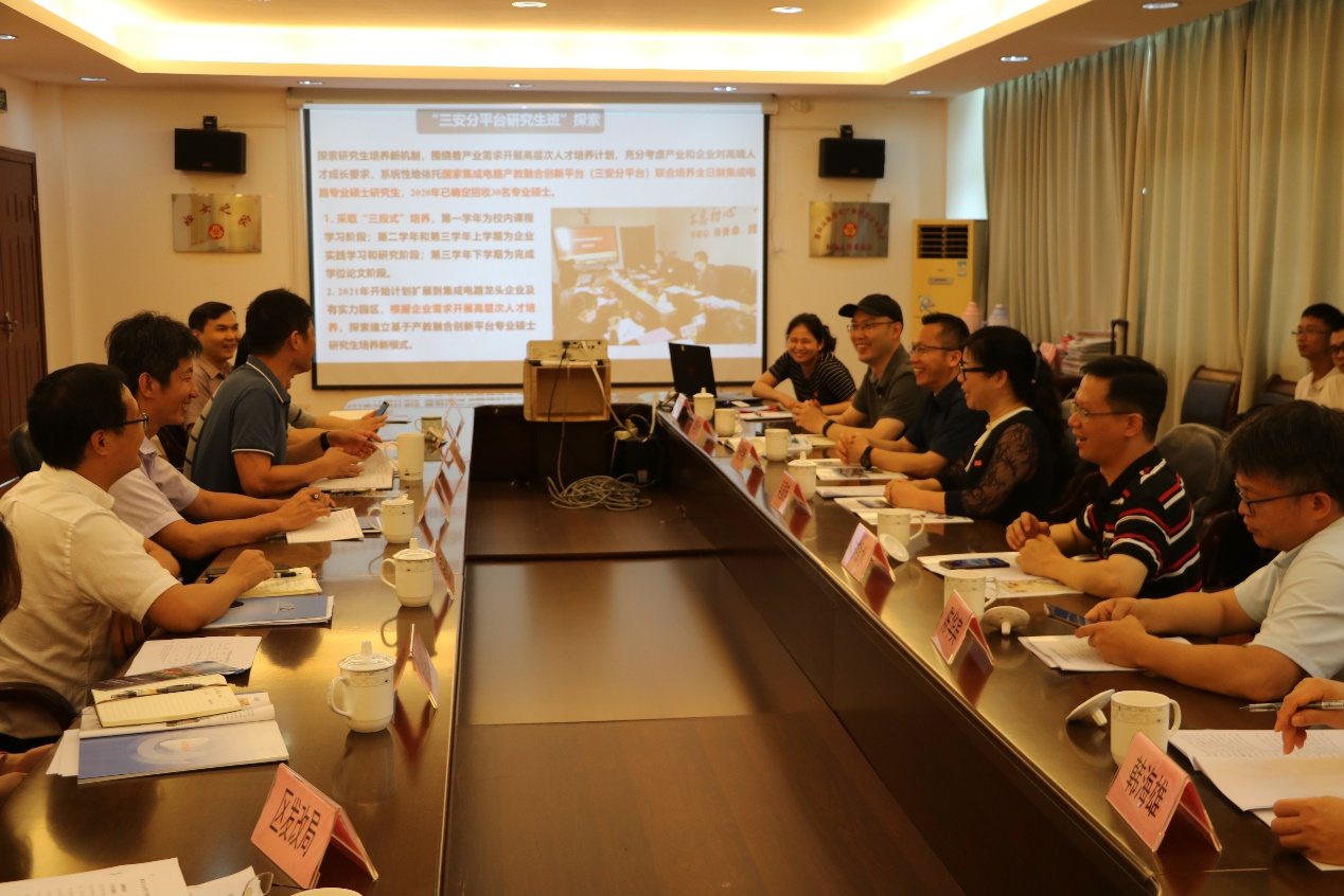 吴国瑛介绍了学院的概况和国家集成电路产教融合创新平台建设情况,学院将以厦门大学与福建省九市一区校地战略合作为契机积极开展学院与地方合作,助推莆田市电子信息产业发展,努力为莆田市建设贡献厦大电子智慧和力量。杨伟锋教授作为闽江学者特聘教授、国家集成电路产教融合创新平台班班主任,在新型半导体材料与器件领域有着丰硕的研究成果和产学研融合经验。作为莆田籍的专家学者,杨伟锋在交流环节积极发言,希望推动科研成果落地,用所学回馈家乡。