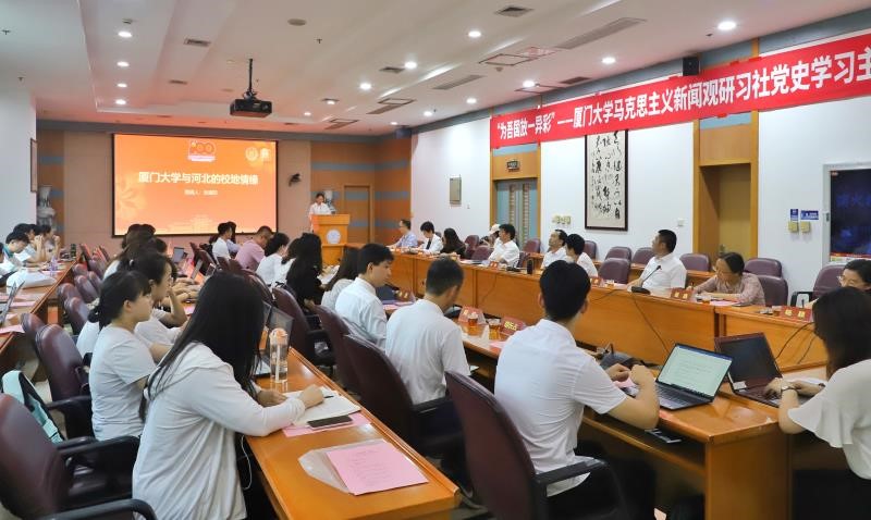 5月24日下午,我校思想政治类学生社团“马克思主义新闻观研习社”在颂恩楼220会议室举办了一场精心准备的党史学习主题活动,与会师生围绕《为吾国放一异彩——厦门大学与伟大祖国》一书开展研读和座谈交流。本次活动由新闻传播学院党委和校团委联合主办,校党委副书记徐进功参加活动并作点评讲话。