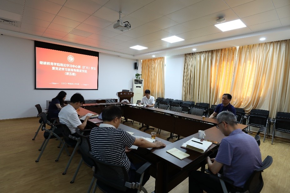 5月27日上午,继续教育学院党总支在海韵学生公寓二期食堂306会议室召开理论学习中心组(扩大)学习暨党史学习教育第五期专题读书班,围绕“党的十八大以来的历史”主题开展学习交流。学院理论学习中心组全体成员、各在职教职工党支部书记参加了学习,校党委党史学习教育第七指导组组长洪永强列席指导。