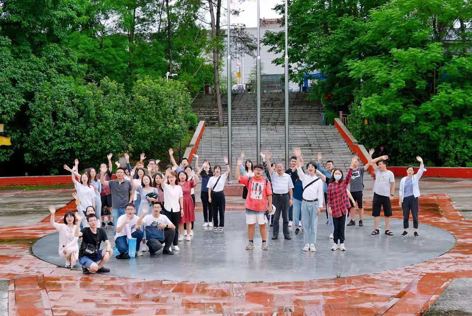“我志愿加入中国共产党,拥护党的纲领,遵守党的章程,履行党员义务,执行党的决定,严守党的纪律,保守党的秘密,对党忠诚,积极工作,为共产主义奋斗终身,随时准备为党和人民牺牲一切,永不叛党。”在红军烈士纪念塔前,师生一行为牺牲的革命烈士鞠躬、敬献花篮、重温入党誓词、作党旗下的讲话。“绕廓绵江自在流,云龙桥上为凝眸。西山白塔虽仍旧,田亩无私迥不侔……”这是1960年董必武同志再次来到瑞金时写下的诗句《访问瑞金》。在《重走长征路》的行程中,师生一行突遇大雨,在村中躲雨的过程中,师生们临时起意做一场文艺汇演。一时间,师生查阅与瑞金相关的故事、歌曲、诗歌,拿起竹斗笠、红缨枪,共同演绎了一场“穿越时空”的红色之旅。在此次瑞金之行的最后一站——中华苏维埃纪念园——师生自发走到中国地图前,站在自己的家乡的位置,品味“人民共和国从这里走来”的深刻内涵。