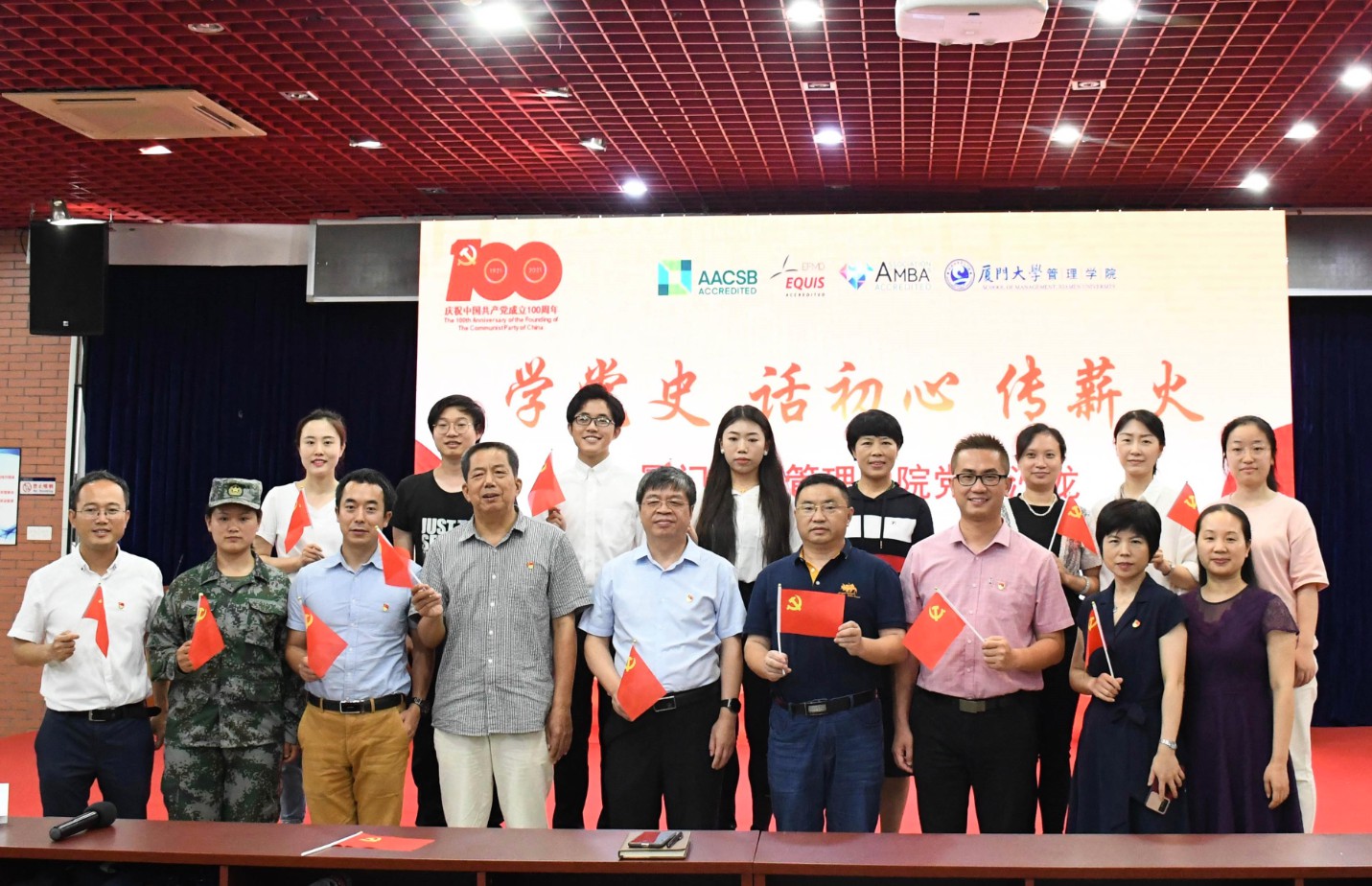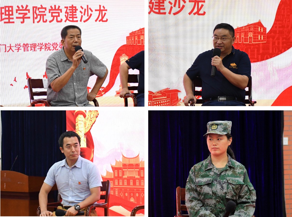 本次活动邀请了老中青三代优秀党员共聚一堂,分享入党初心和奋斗故事,畅谈党史教育与党员担当。受邀的四位分享嘉宾是厦门大学特邀党建组织员、基层党建工作联络员、管理学院原党委副书记黄定基,福建省青年五四奖章获得者、管理学院教授魏敏,全国高等学校创业教育先进个人、管理学院团委副书记揭上峰,管理学院退伍女兵、2019级旅游管理专业本科生彭派。