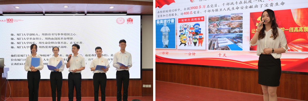 来自法学院的张浩、马克思主义学院的马锋、公共卫生学院的王家伟、台湾研究院的张萱妍和徐梦琪等5位同学共同组成了“诗情厦意”宣讲队,以朗诵原创诗歌的方式深情演绎了厦门大学的四种“优良校风”,他们慷慨激昂的朗诵带领师生们体验了一次穿越时空的诗意之旅。