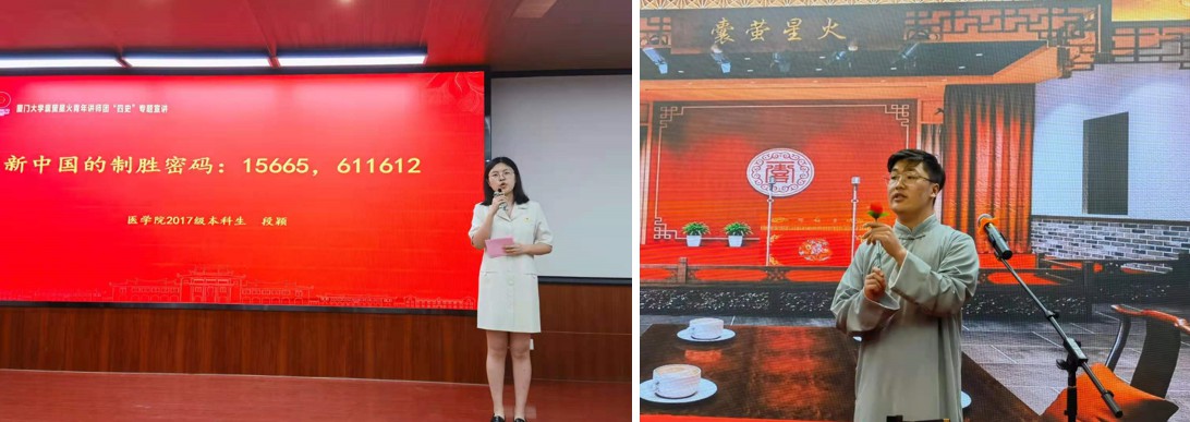 6月3日晚,在经济学院N302报告厅,厦门大学囊萤星火青年讲师团成员围绕“四史”宣传教育,以“新中国的制胜密码:15665,611612”“百年前‘00’后的初心故事”“抗‘疫’大考里跑出的青年‘加速度’”“不爱红妆爱戎装:我的军旅‘四季歌’”等为题,为经济学院120余名青年学子带来了一堂充满青年范和时代味的“四史思政课”。