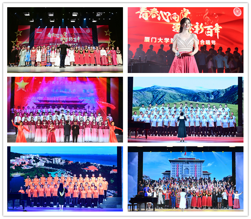 汇演当晚,31个学院、队伍,32支合唱队齐聚一堂,用美妙动人的歌声表达对党和国家的祝福。各合唱团演唱曲目类型多样,《我和我的祖国》《歌唱祖国》《唱支山歌给党听》《军民团结一家亲》等歌曲唱出学子们的爱国爱党热情,《凤凰花开的路口》《鼓浪屿之波》等表达对厦门与母校的依恋,《我和2035有个约》《我们的新时代》等则抒发了新时代年轻人浓厚的家国情怀。