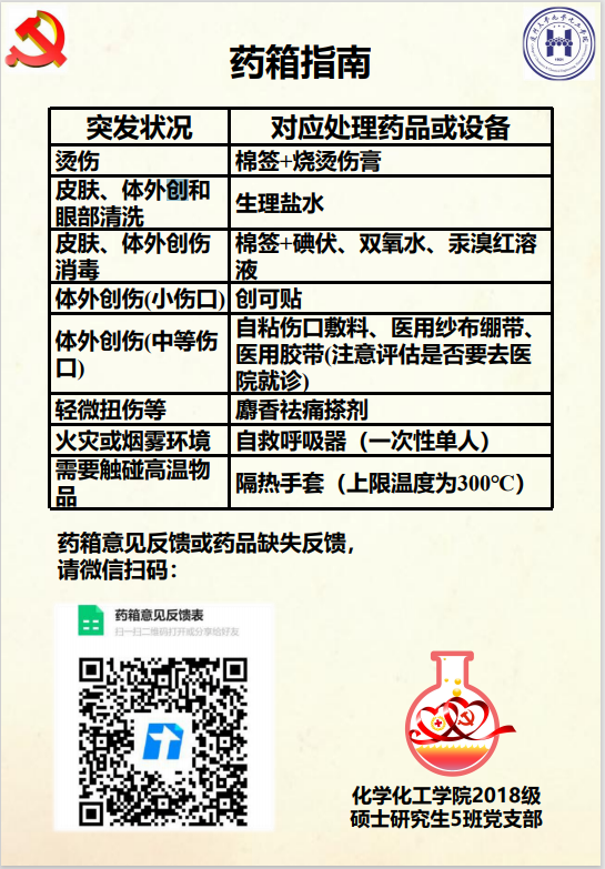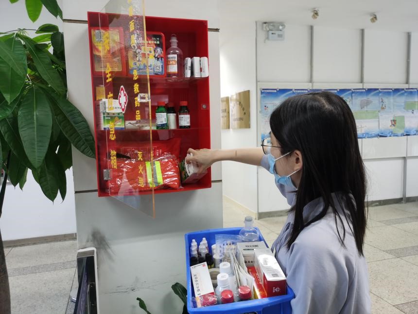 在双一流学科建设道路上,不仅有化院师生在科学前沿的谋求创新,更有安全管理与后勤供应的“双一流”服务,力求全心全意为师生的科研工作保驾护航。为应对突发情况,防止实验意外对人身安全造成威胁,进一步加强实验室安全管理,化学化工学院为院楼每个楼层都配置了应急药箱。应急用品包括灭火毯、烧烫伤膏药、碘酊、双氧水、麝香祛痛搽剂等,满足学院师生的应急需求,受到大家的一致好评。