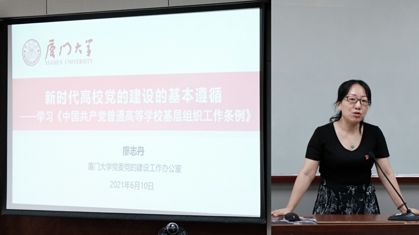 廖志丹还指出,高校基层党建工作要深刻践行“四个服务”,即为人民服务、为中国共产党治国理政服务、为巩固和发展中国特色社会主义制度服务、为改革开放和社会主义现代化建设服务。她强调,党团建设和学科教育应该是并行的,各支部书记要在自身学懂弄通《条例》精神和有关规定基础上,确保将相关内容有效传达到管理学院每一个基层党组织、每一名党员,让每名党员能够全面掌握《条例》内容,严格落实《条例》规定,推进基层党组织全面过硬、全面进步。会上,廖志丹还融入厦门大学近年来党建活动的成功案例以及先进个人典型,引导师生党员在典型事例中明确工作方向、完善工作方法。